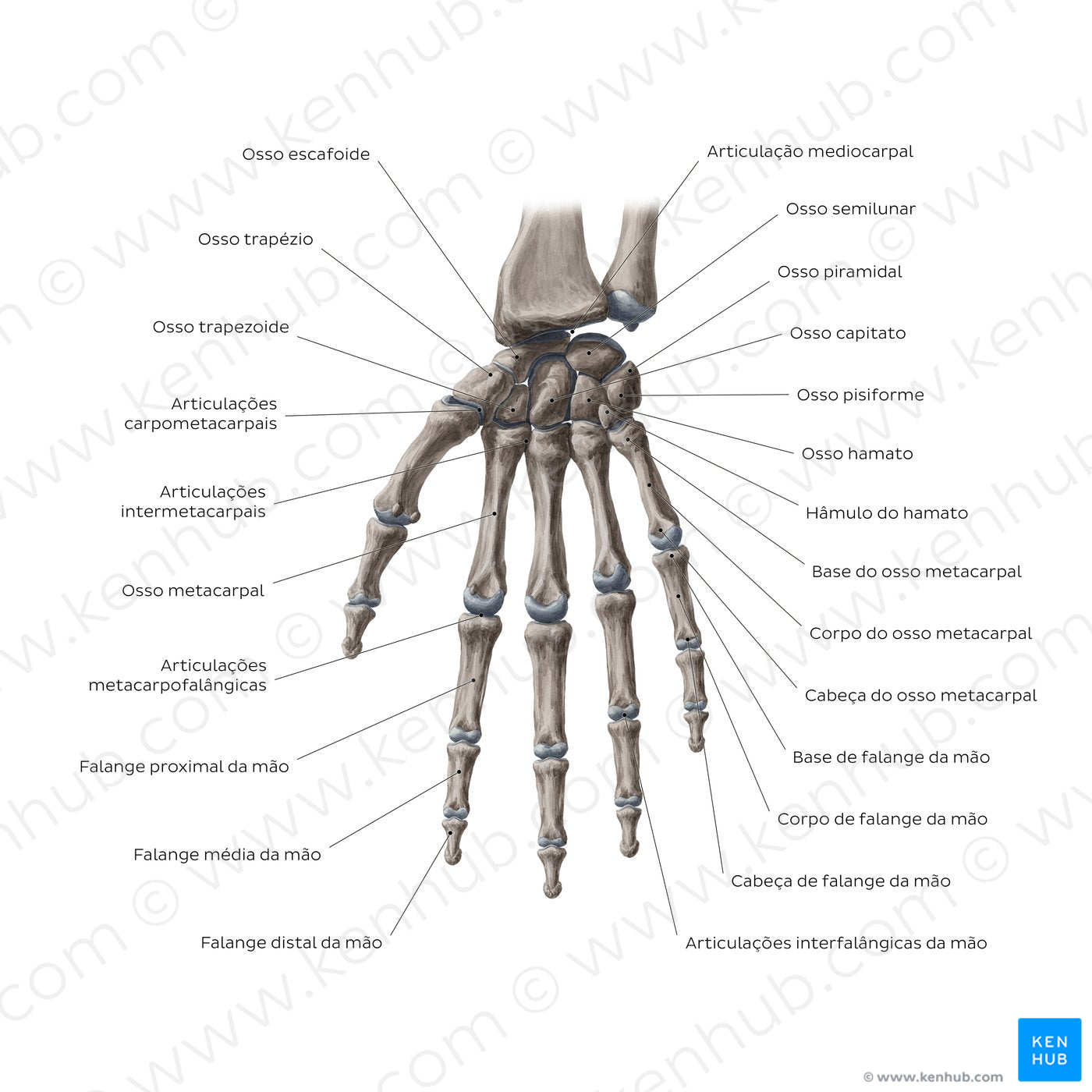 A imagem seguinte mostra os ossos do punho e da mão de uma perspetiva palmar (ventral). Note que os músculos se dividem em três grupos: carpais, metacarpais, e falanges. Observe que as articulações que conectam os ossos é nomeada de acordo com os ossos que participam da sua formação (ex. carpo-metacarpal).