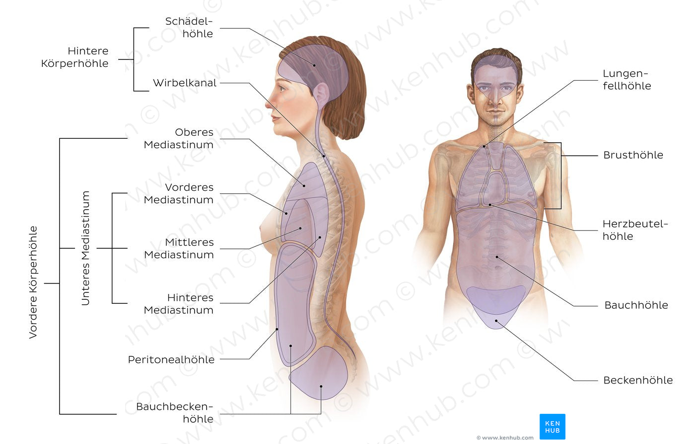 Entsprechend ihrer Lage unterscheidet man zunächst zwei große Körperhöhlen: eine vordere und eine hintere. Die hintere Körperhöhle besteht aus der Schädelhöhle und dem Wirbelkanal. Die vordere Körperhöhle wird weiter in die Brust- und in die Bauchbeckenhöhle unterteilt. Die Brusthöhle besteht aus weiteren kleineren Räumen, in denen die Luftröhre, die Speiseröhre, die Lunge und das Herz liegen. Die Bauchhöhle und die Beckenhöhle beherbergen die Bauch- und Beckenorgane.