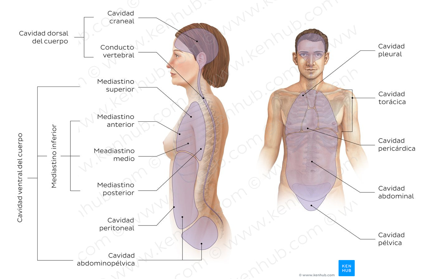 Las principales cavidades del cuerpo son clasificadas en dos grupos de acuerdo a su localización; cavidad dorsal y cavidad ventral. La cavidad dorsal consiste en la cavidad craneal, que alberga al cerebro y al canal vertebral, el cual contiene la médula espinal. La cavidad ventral está compuesta por las cavidades torácica y abdominopélvica. La cavidad torácica contiene varios espacios más pequeños que contienen la tráquea, los pulmones, el esófago y el corazón. La cavidad abdominopélvica se subdivide en cavidades abdominal y pélvica, las cuales contienen órganos abdominales y pélvicos respectivamente.