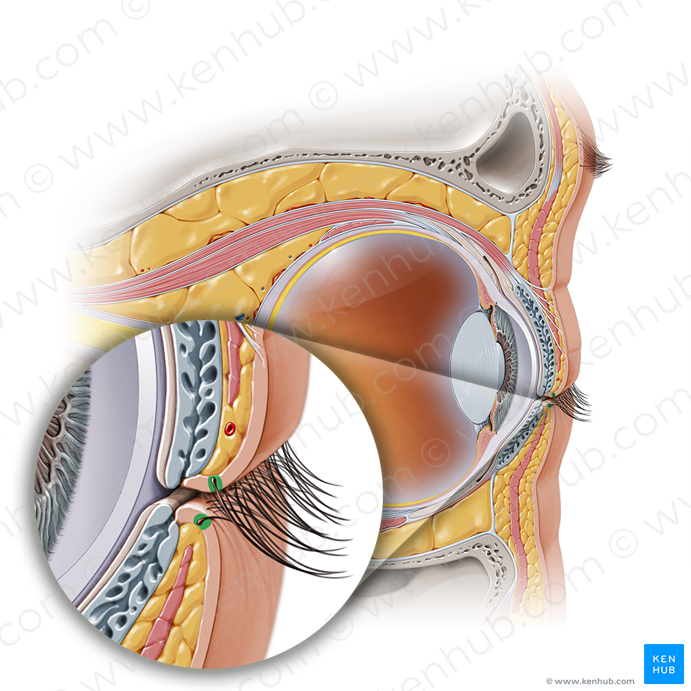 Shown from sagittal perspective. Also known as Glands of Moll and Zeis.