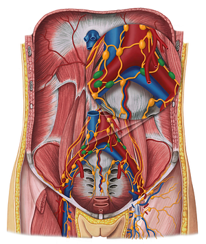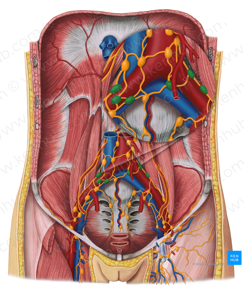 Shown from anterior perspective. Also known as Posterior iliac lymph nodes, and Superior iliac lymph nodes.