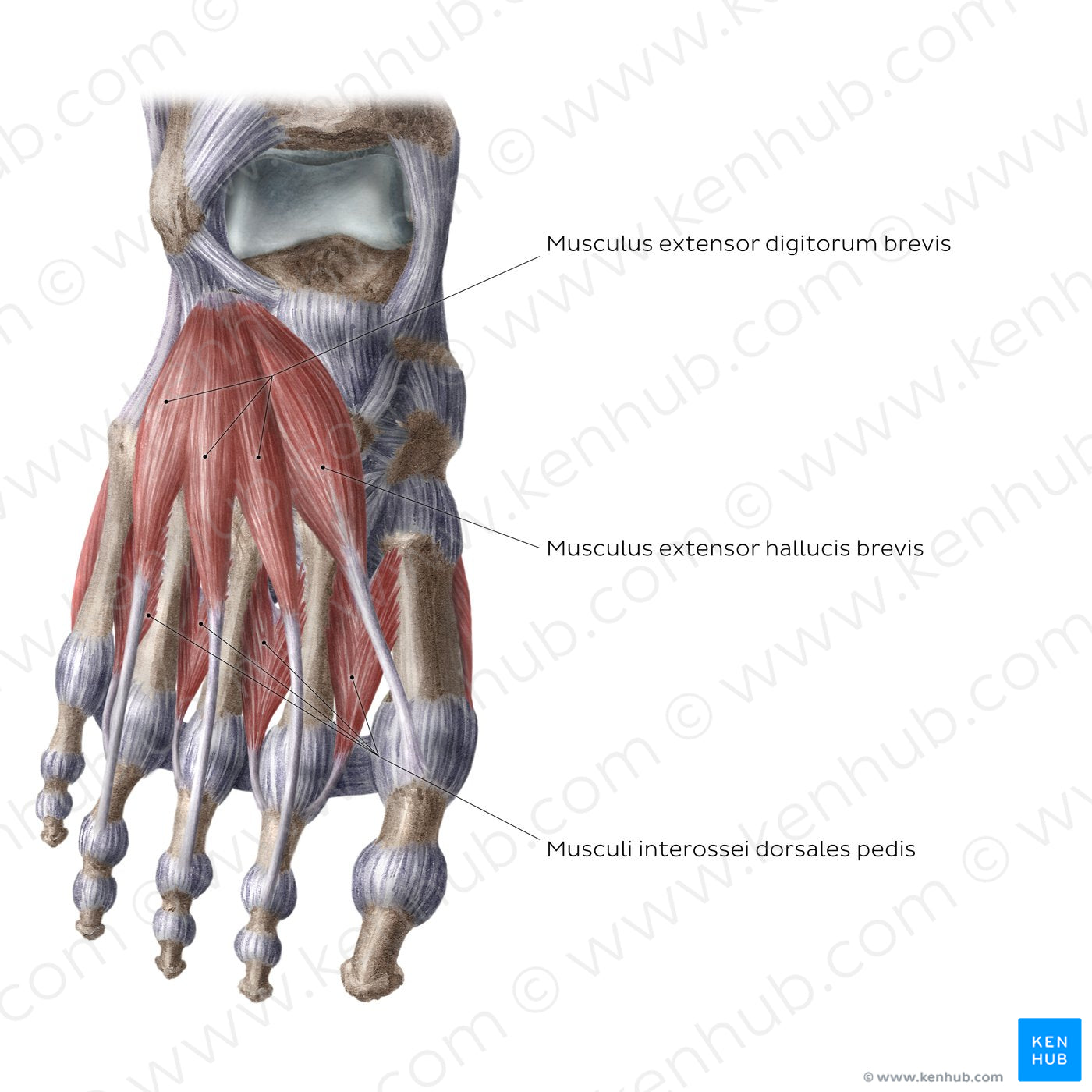 The mm. dorsales pedis are composed of two muscles: the m. brevis hallucis and m. brevis digitorum. Both muscles originate from the superolateral surface of the calcaneus and extend distally across the dorsum of the foot (dorsum pedis), lateral to the tendons of their ‘longus’ counterparts. The mm. interossei dorsales are part of the stratum quartum of the mm. plantares pedis, but are best viewed from this dorsal perspective. They are located between the ossa metatarsi and consist of four bipennate muscles which arise from opposing surfaces of adjacent bones. The first (most medial) m. interosseus dorsalis inserts into the medial aspect of the base of the phalanx proximalis of the second toe, while the lateral three muscles insert into the lateral aspect of the bases of the phalanges proximales digitorum 2-4.