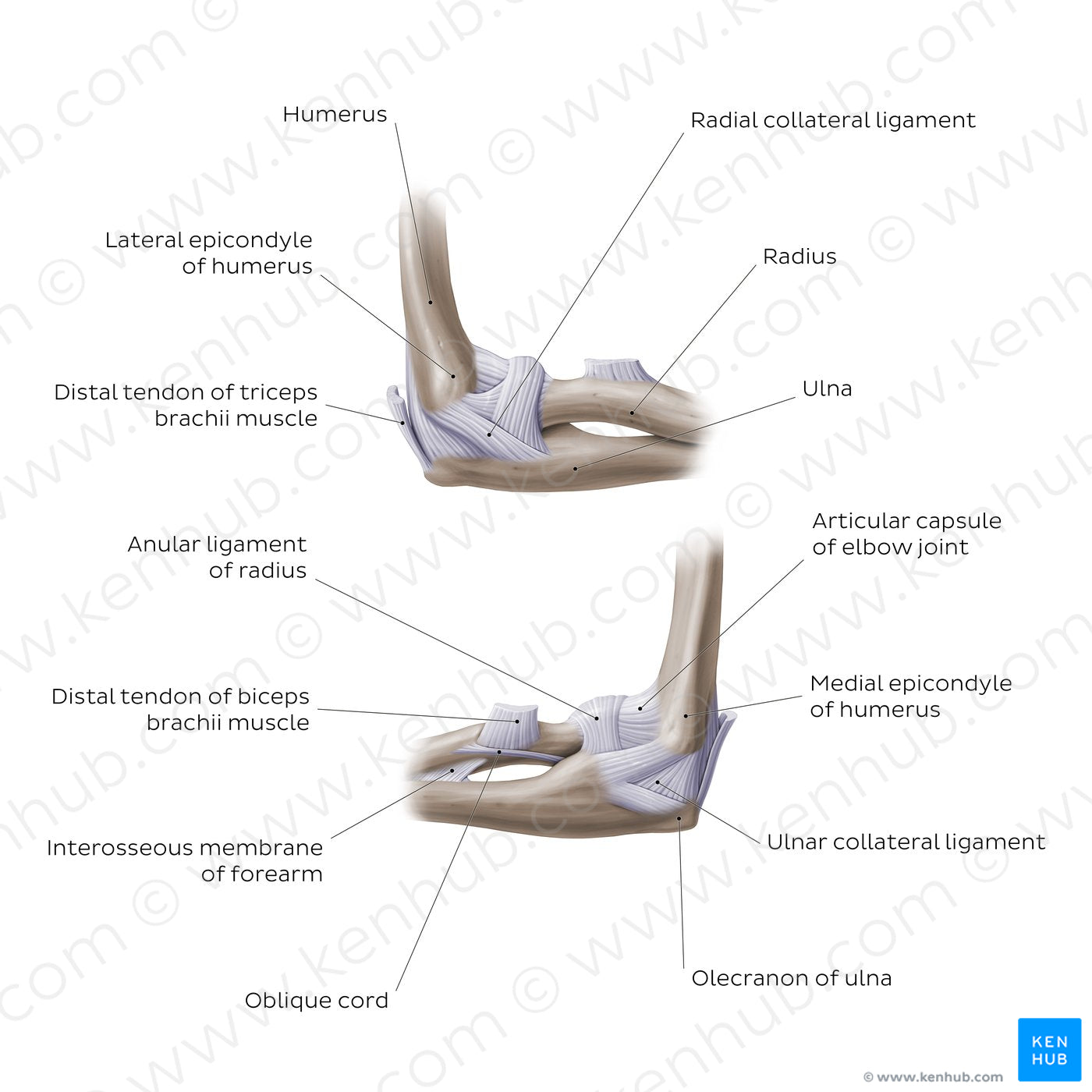 The elbow joint is made up of three joints including the humeroulnar, humeroradial and proximal radioulnar joints. The humeroulnar joint is between the trochlea on the medial aspect of the distal end of the humerus and the trochlear notch on the proximal ulna. The humeroradial joint is formed between the capitulum on the lateral aspect of the distal end of the humerus with the head of the radius. The proximal ends of the radius and ulna articulate with each other at the proximal radioulnar joint. There are three main ligaments that support the elbow joint: the ulnar collateral ligament, radial collateral ligament and anular ligament. The ulnar and radial collateral ligaments are each made up of three component parts: -Ulnar collateral ligament: anterior bundle, posterior bundle, and transverse bundle (Cooper's ligament). -Radial collateral ligament: annular ligament, radial collateral ligament (proper), and lateral ulnar collateral ligament.