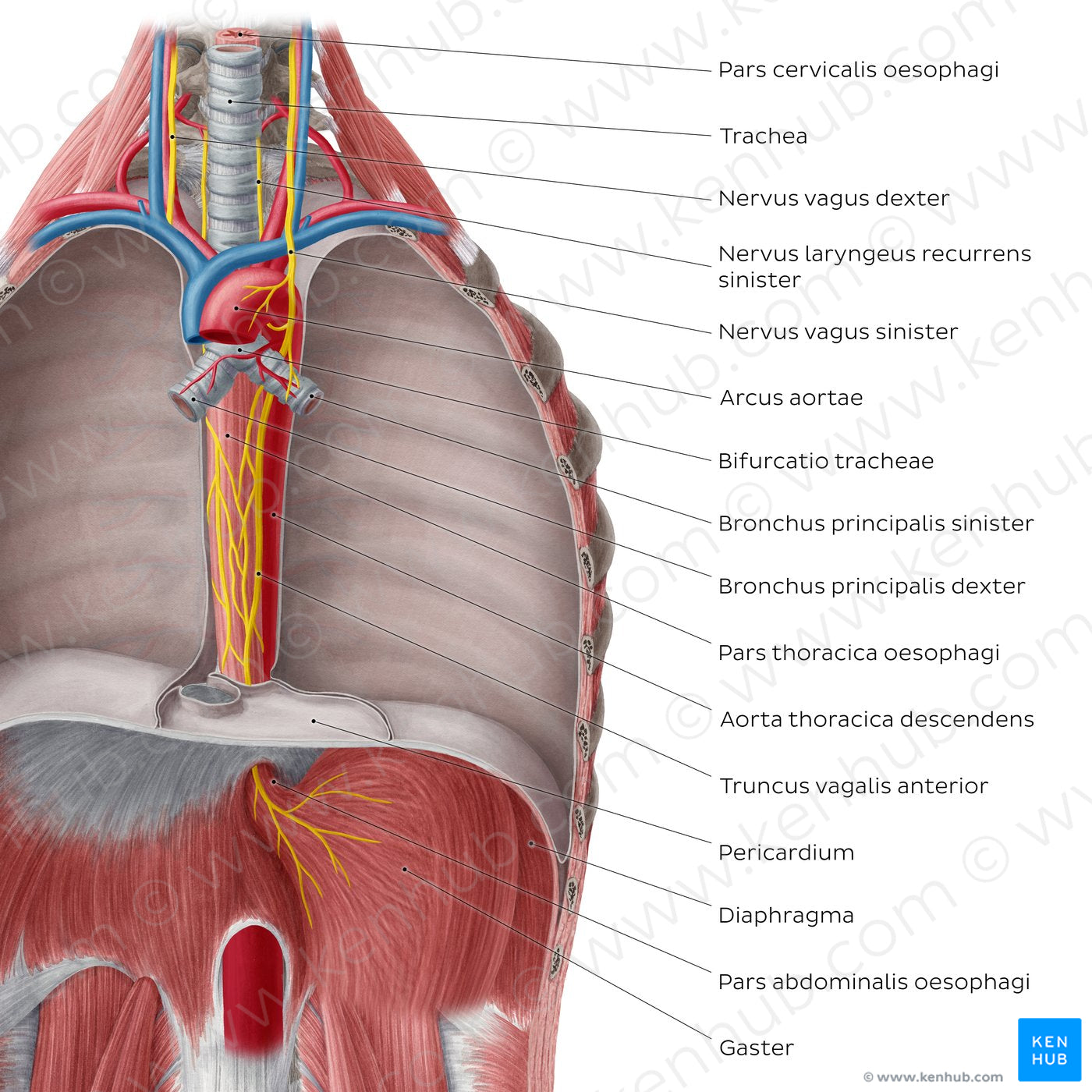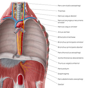 The oesophagus is located posterior to the trachea and anterior to the columna vertebralis. On its course, it is closely associated with several structures, such as aorta thoracica, bronchus principalis sinister, and atrium sinistrum cordis (not visible here). The pars cervicalis oesophagi begins at the pharyngoesophageal junction (junctio pharyngooesophagealis) and ends at the entry into the apertura thoracis superior. The pars thoracica oesophagi travels through the mediastinum superius et posterius inferius. It ends at the hiatus oesophageus where the oesophagus passes through the diaphragma thoracicum. The pars abdominalis oesophagi lies intraperitoneally. It starts where the oesophagus passes through the diaphragma thoracicum and terminates at the ostium cardiale gastris (Junctio oesophagogastrica).