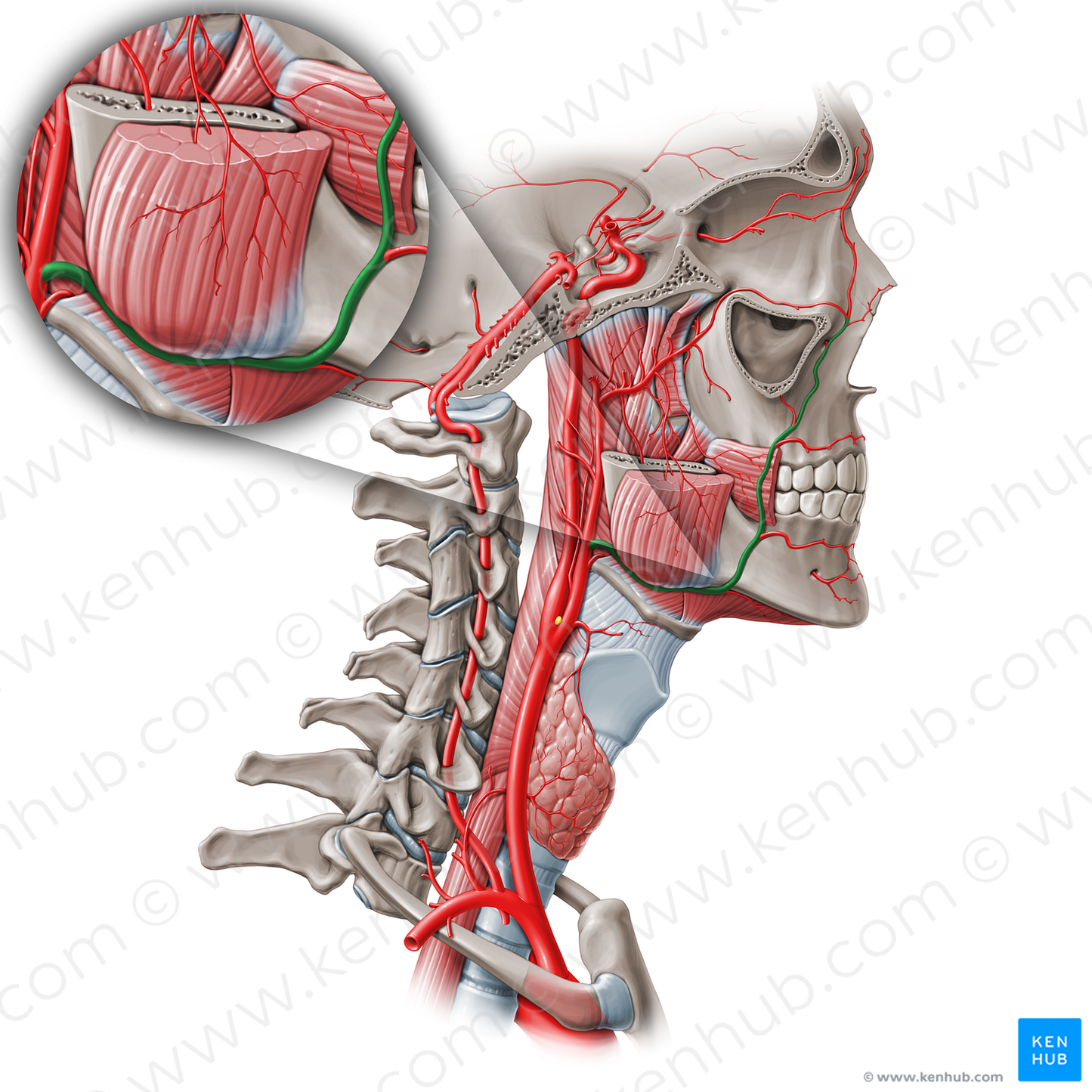 Shown from lateral right perspective. Also known as External maxillary artery.