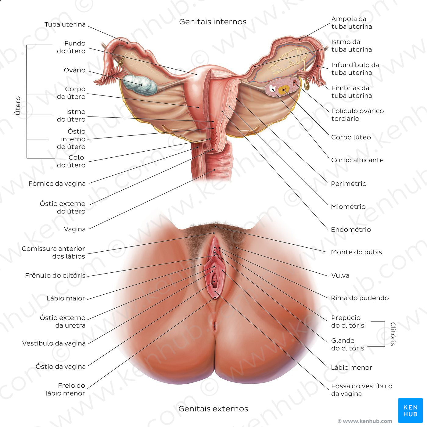 A imagem de cima mostra uma visão geral dos genitais internos femininos, enquanto a imagem de baixo mostra as partes principais dos genitais externos femininos.