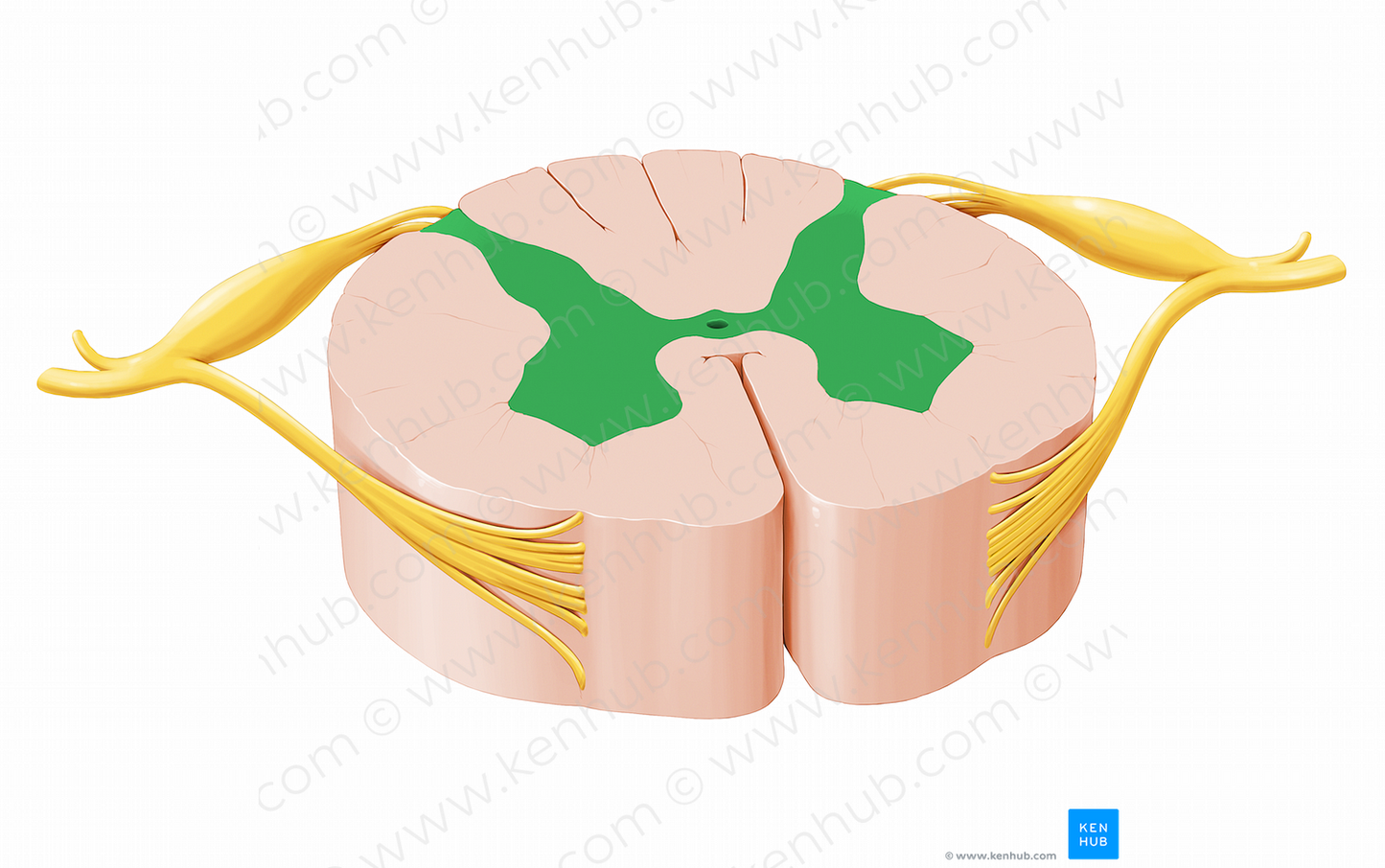 Shown from axial perspective. Also known as Grey matter, Grey matter of spinal cord, and Gray matter of spinal cord.