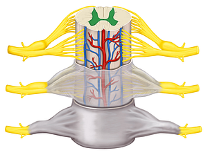 Shown from anterior perspective. Also known as Grey matter, Grey matter of spinal cord, and Gray matter of spinal cord.
