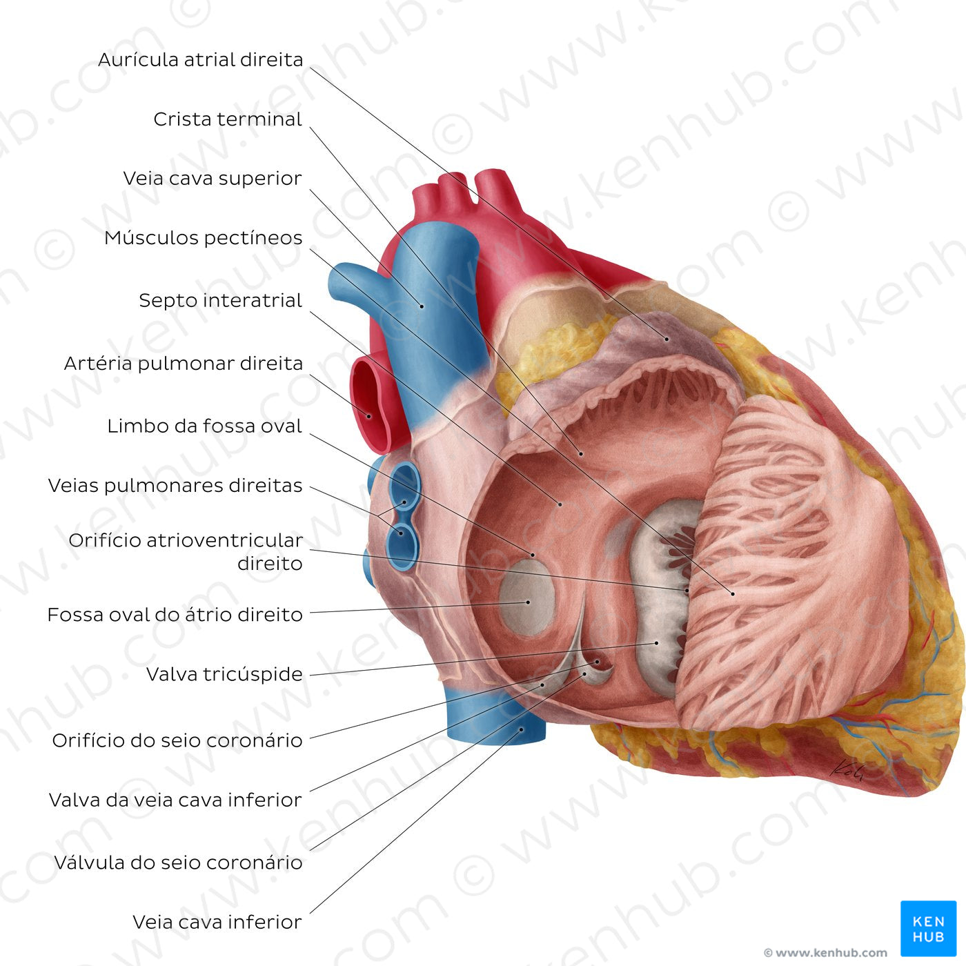 Esta imagem mostra o interior do átrio direito, com a sua parede anterior rebatida. A superfície interna da parede anterior tem uma aparência rugosa devido à presença dos músculos pectíneos. Essas pregas musculares estão organizadas ao redor da região da aurícula direita, que funciona como um reservatório de volume, aumentado a capacidade do átrio direito durante os momentos de dilatação. As demais paredes são lisas e permitem a observação de vários marcos anatômicos: a fossa oval, as válvulas da veia cava inferior e o seio coronário, bem como o orifício atrioventricular direito.