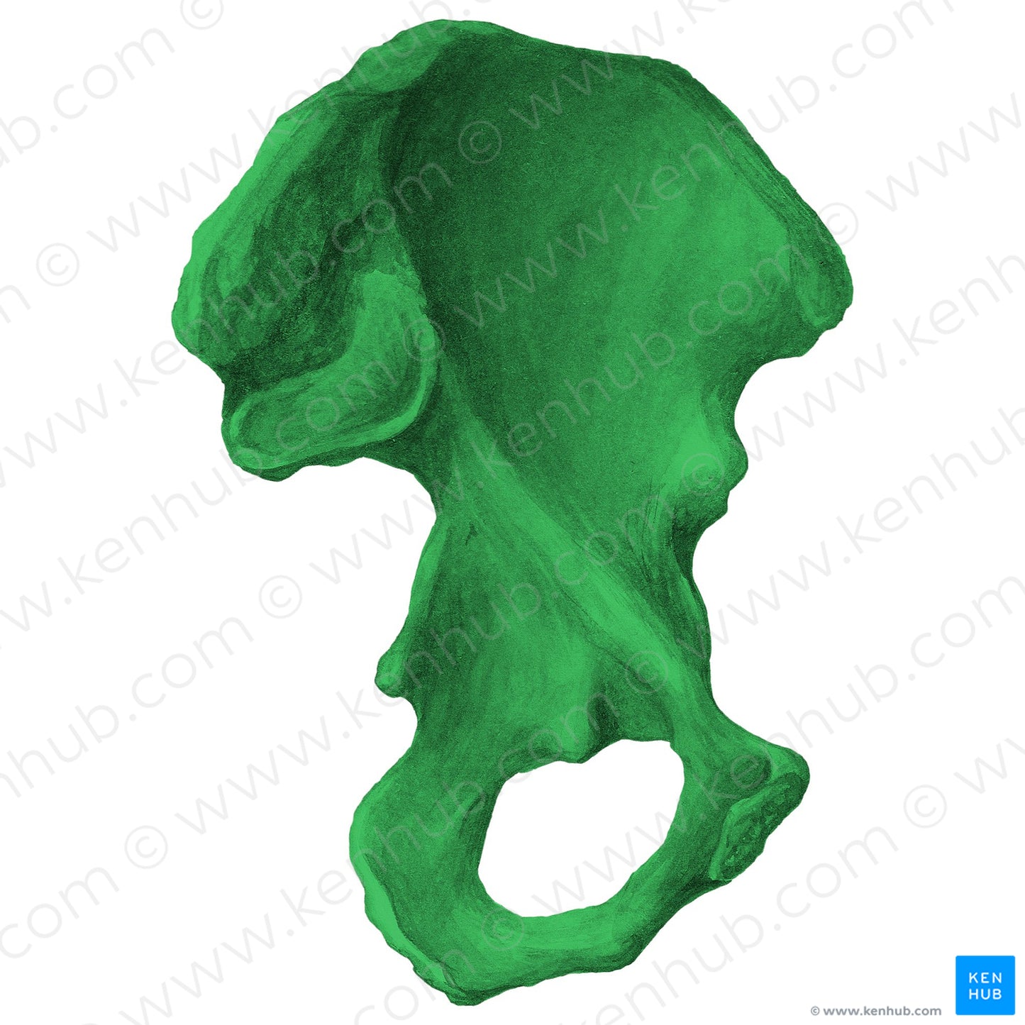 Shown from medial perspective. Also known as Coxal bone, Pelvic bone, and Innominate bone.