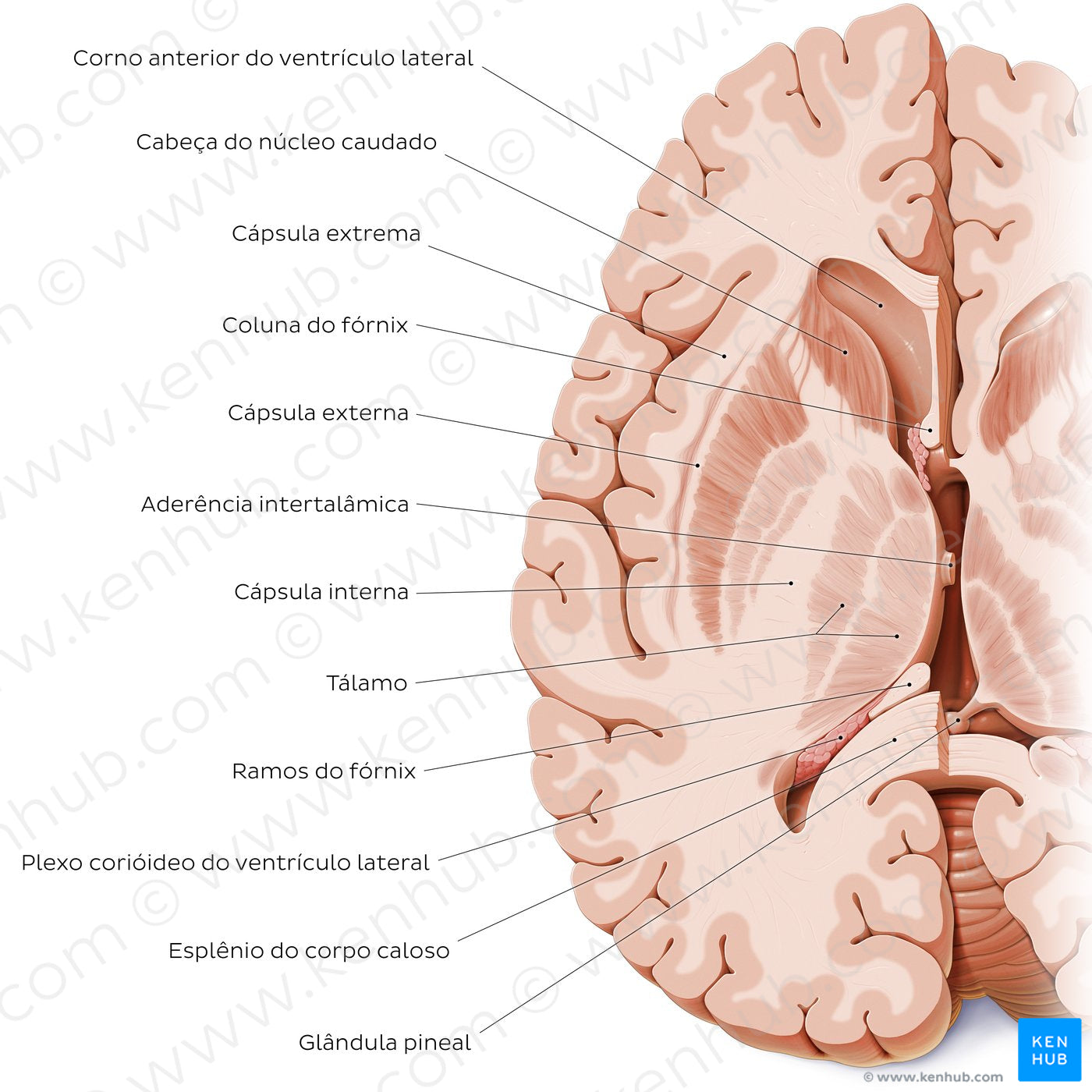 Esta imagem destaca o lado esquerdo do encéfalo, visto em um corte transversal ao nível do joelho do corpo caloso (A). As estruturas de substância cinzenta mais evidentes nesse corte são o tálamo, localizado profundamente na substância branca, e os núcleos da base, constituídos pelo núcleo caudado (somente o corpo e a cauda são visíveis), pelo putâmen e pelo globo pálido. Adicionalmente vemos os tratos de substância branca (cápsulas interna, externa e extrema). Tanto no corte A quanto no B podemos ver as diferentes partes da cápsula interna: ramo anterior, ramo posterior, parte retrolentiforme e joelho. O corte A revela algumas partes dos feixes de substância branca que conectam os dois hemisférios cerebrais, particularmente o joelho e o esplênio do corpo caloso e a coluna e os ramos do fórnix. Finalmente, nesta imagem podemos ver o terceiro ventrículo e os cornos frontal e occipital dos ventrículos laterais do cérebro. O corno frontal do ventrículo lateral do lado esquerdo está separado de sua contraparte direita por uma fina membrana vertical, chamada de septo pelúcido, que se estende do corpo caloso, superiormente, até o fórnix, inferiormente.