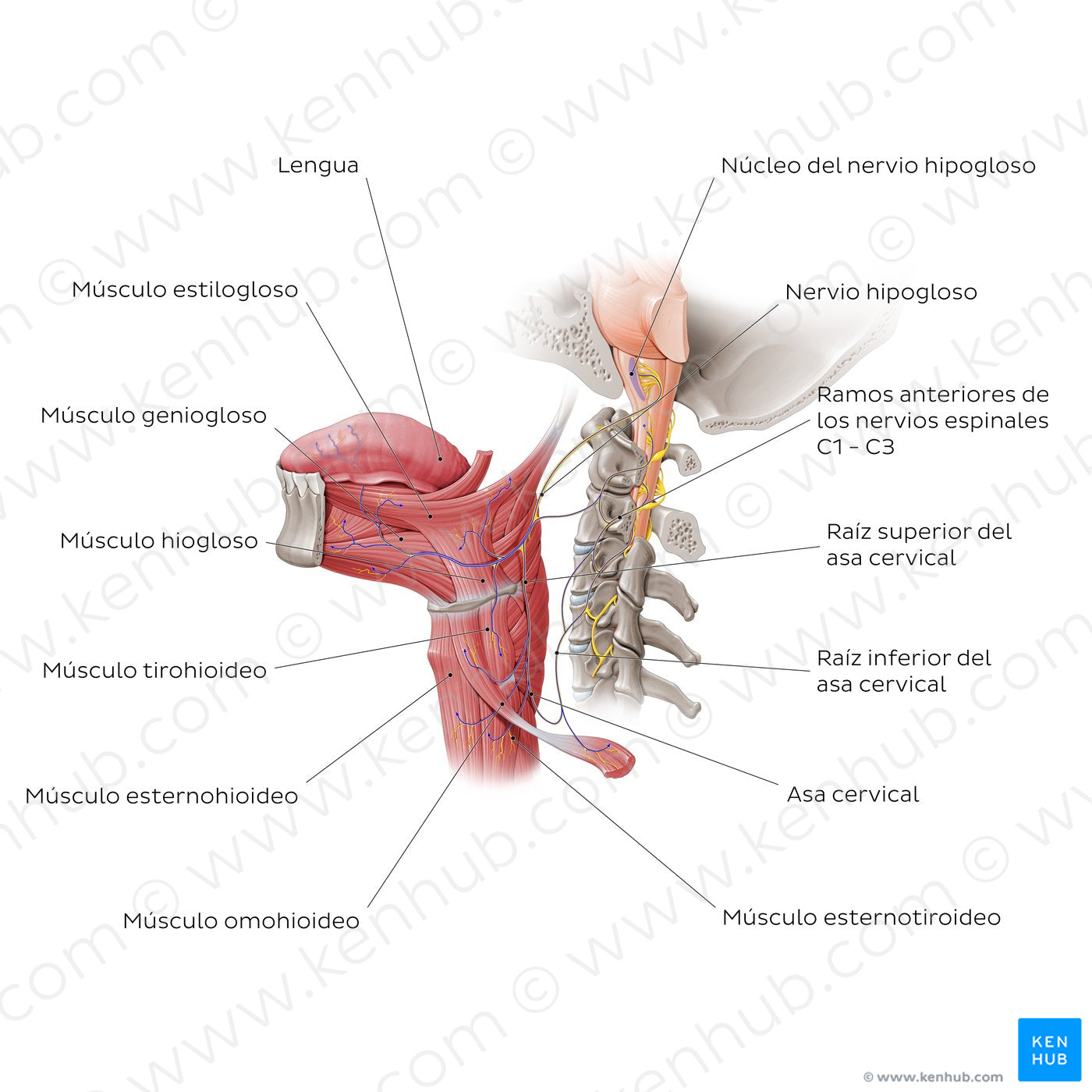 El nervio hipogloso (XII par craneal) surge como una serie de raicillas desde el núcleo del nervio hipogloso del bulbo raquídeo. Las raicillas se unen para formar al nervio propiamente dicho, que luego sale del cráneo a través del conducto del hipogloso del hueso occipital. Durante su recorrido, el nervio hipogloso recibe las fibras del nervio espinal C1 (y/o C2) que se transportan junto a éste, pero sin mezclarse con él. Estas salen del nervio hipogloso como una serie de ramos: ramo meníngeo, raíz superior del asa cervical, ramo para el músculo tirohioideo y ramo para el músculo genihioideo. Los únicos “ramos” verdaderos del nervio hipogloso son los ramos linguales que inervan a los músculos de la lengua. Estos ramos inervan todos los músculos extrínsecos e intrínsecos de la lengua, con la excepción del músculo palatogloso, que está inervado por el nervio vago.