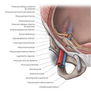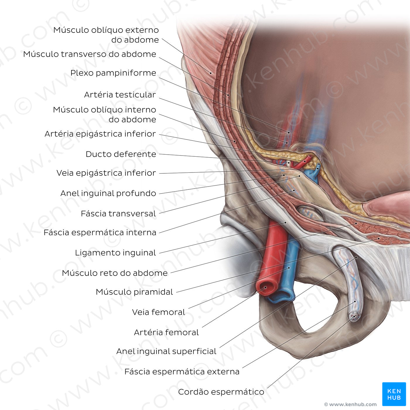 O canal inguinal começa no anel inguinal profundo, localizado no ponto médio entre a espinha ilíaca anterossuperior e o tubérculo púbico. Ele continua através dos músculos abdominais anteriores e termina no anel inguinal superficial (uma abertura em forma de fenda na aponeurose do músculo oblíquo externo do abdome) O teto do canal inguinal é formado pelos músculos oblíquo interno e transverso do abdome. A parede anterior é derivada da aponeurose dos músculos oblíquos interno e externo do abdome. O assoalho é formado pelos ligamentos inguinal e lacunar (não demonstrados na figura). A parede posterior é formada pela fáscia transversal e foice inguinal (tendão conjunto dos músculos oblíquo interno e transverso do abdome).A imagem ilustra o cordão espermático atravessando o canal inguinal. O cordão é envolvido por três camadas de fáscia, derivadas das estruturas musculofasciais da parede abdominal. De superficial para profundo, são elas: fáscia espermática externa (derivada da aponeurose do músculo oblíquo externo do abdome), músculo cremaster e a fáscia cremastérica (derivada do músculo oblíquo interno do abdome e de sua fáscia) e a fáscia espermática interna (derivada da fáscia transversal).O cordão por si só transmite várias estruturas para e a partir dos testículos: as artérias testicular e cremastérica, a artéria do ducto deferente, o plexo venoso pampiniforme, o nervo ilioinguinal, o ramo genital do nervo genitofemoral e o ducto deferente.