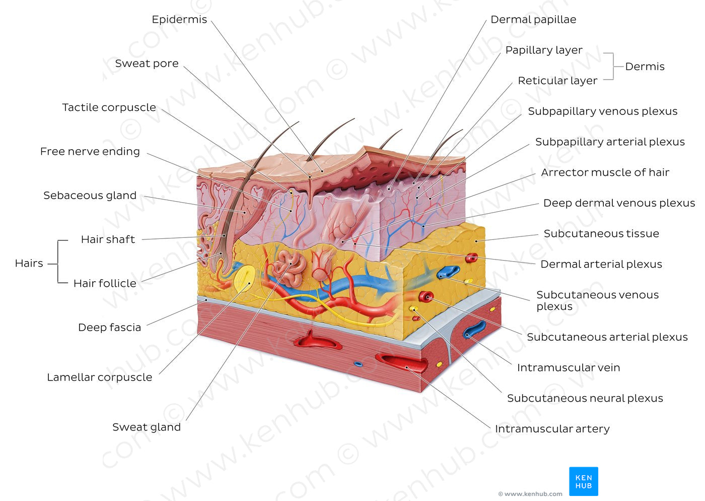 A cross section showing the layers of the integumentary system from superficial to deep: the skin, subcutaneous tissue and deep (muscular) fascia. The skin appendages are shown originating from various skin levels and protruding through the skin surface.