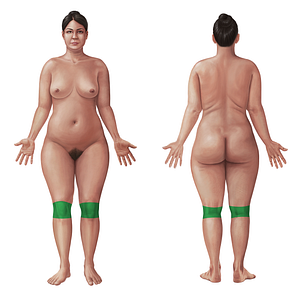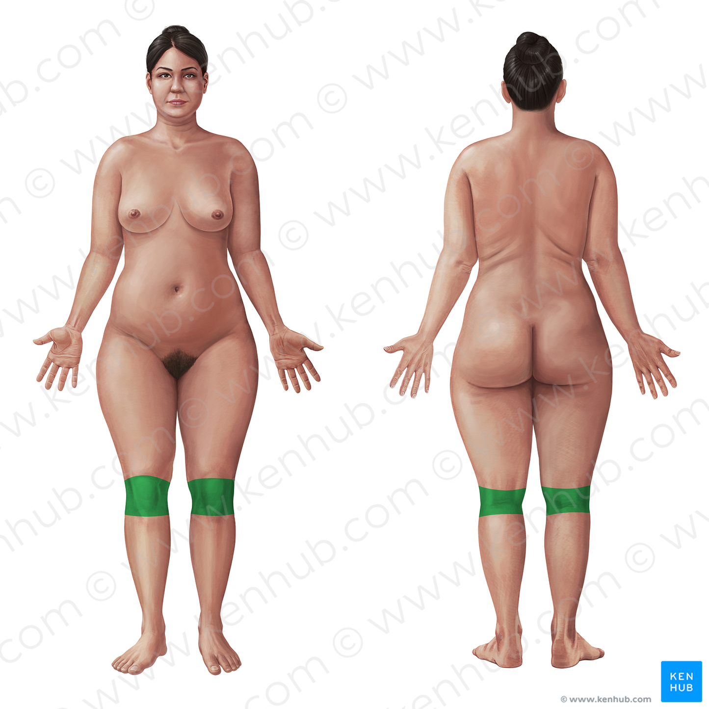 Shown from anterior perspective. Also known as Knee region, and Genual region.