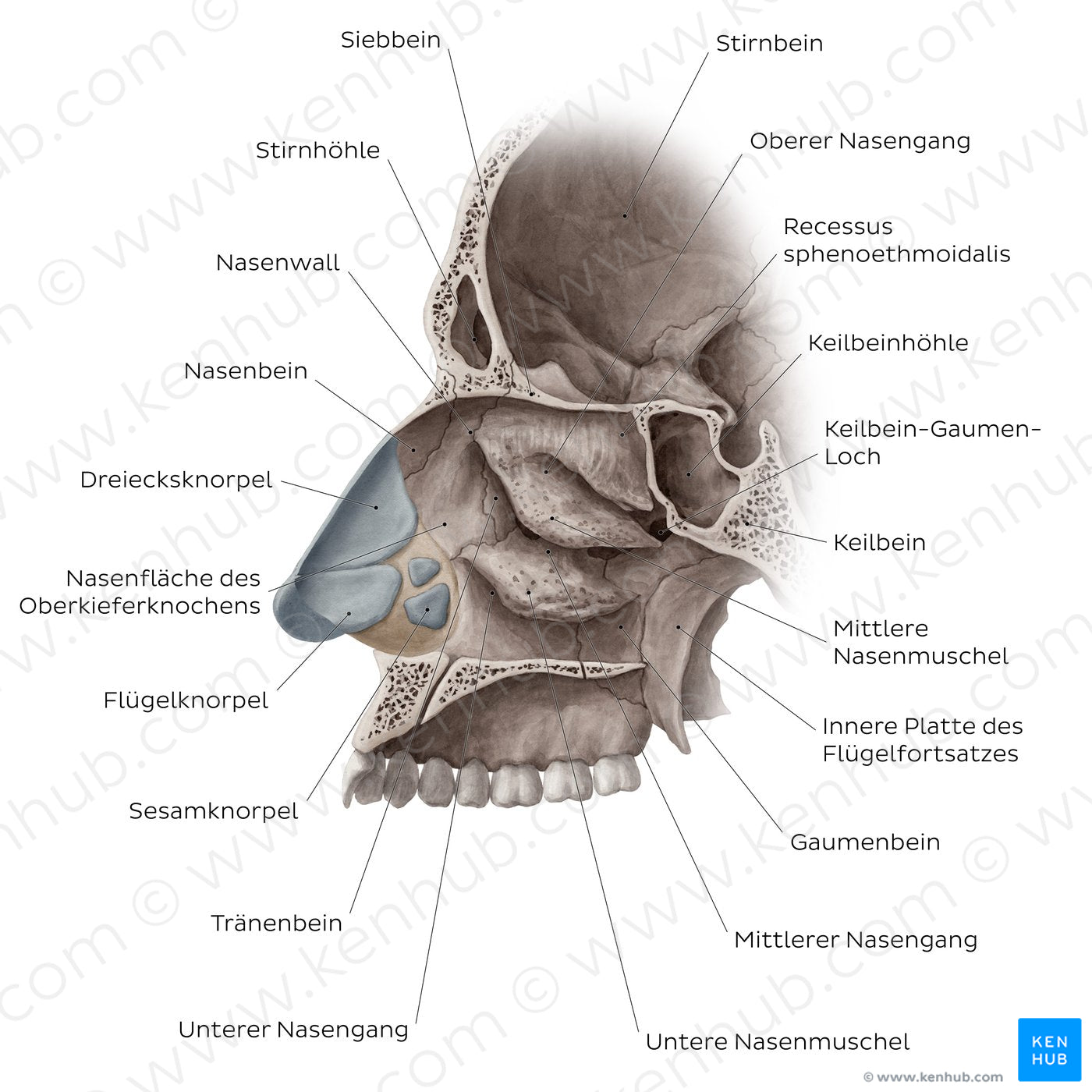 Jede Nasenhöhle hat eine vordere und hintere Öffnung. Die vorderen Öffnungen sind die Nasenlöcher (Nares), während die Nasenhöhle über die hinteren Nasenöffnungen in den Nasenrachen mündet. Das Dach der Nasenhöhle beherbergt die Siebplatte, die den Durchtritt zahlreicher Riechnerven zur Vermittlung des Geruchssinns ermöglicht. Der Grund des harten Gaumens trennt die Nasenhöhle von der Mundhöhle. Die mediale Wand wird nach vorne durch Knorpel und nach hinten durch das sehr dünne Pflugscharbein und die vertikale Platte des Siebbeins gebildet. Beide sind von einer dünnen Schleimhautschicht bedeckt. Die laterale Wand beider Nasenhöhlen weist drei gekrümmte oder wellenförmige Knochenplatten auf, dies sind die obere, die mittlere und die untere Nasenmuschel. Sie ragen medial in die Nasenhöhle hinein und bilden vier Luftkanäle, durch die eingeatmete Luft strömen kann und die die Oberfläche der lateralen Wand gegenüber der durchströmenden Luft vergrößern. Von unten nach oben sind die vier Luftkanäle der untere Nasengang, der mittlere Nasengang, der obere Nasengang und der Recessus sphenoethmoidalis.