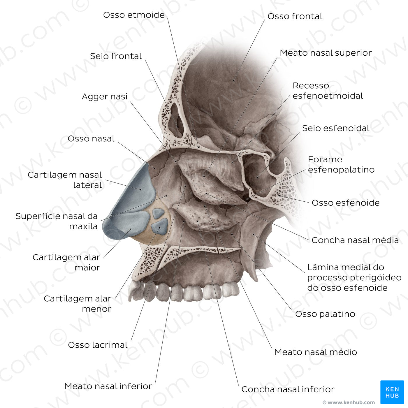 Cada cavidade nasal tem uma abertura anterior e uma posterior. As aberturas anteriores da cavidade nasal são as narinas, enquanto posteriormente ela se abre na nasofaringe através das coanas. O teto da cavidade abriga a placa cribriforme, uma estrutura que permite a passagem de vários nervos olfatórios que conduzem o sentido do olfato. Seu assoalho é formado pelo palato duro, que separa a cavidade nasal da cavidade oral. A parede medial é formada anteriormente por cartilagem e posteriormente por um osso muito fino, o vômer, e pela lâmina perpendicular do osso etmoide. Ambos são cobertos por um revestimento fino de mucosa. A parede lateral de cada cavidade nasal apresenta três “prateleiras” curvas, ou onduladas, de osso, que são as conchas nasais superior, média e inferior. As conchas se projetam medialmente na cavidade nasal formando quatro canais aéreos através dos quais o ar inalado flui, aumentando assim a área de superfície da mucosa nasal. Os quatro canais são, de inferior para superior, o meato nasal inferior, o meato nasal médio, o meato nasal superior e o recesso esfenoestmoidal.