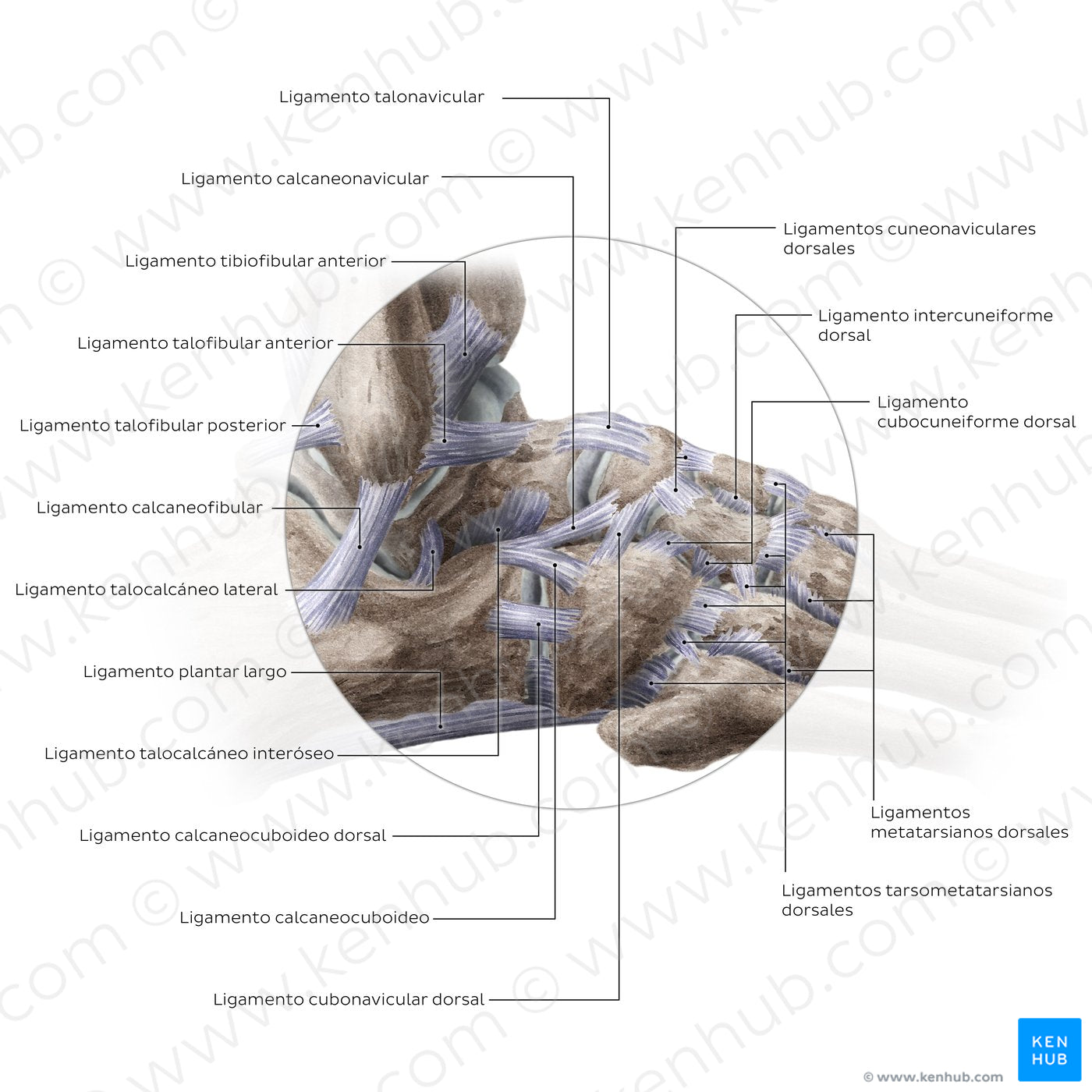 Las articulaciones del pie se mantienen en posición gracias a numerosos ligamentos plantares, dorsales e interóseos.Desde esta perspectiva lateral, se pueden identificar varios ligamentos importantes:Los ligamentos talocalcáneos lateral, anterior e interóseo proporcionan soporte a la articulación subtalar, mientras que, dorsalmente, la articulación transversa del tarso está sostenida por los ligamentos calcaneonavicular y calcaneocuboideo (que en conjunto se denominan ligamento bifurcado), así como por los ligamentos talonavicular y calcaneocuboideo dorsal. Se pueden observar varios ligamentos adicionales que sostienen la cara dorsal o superior de las articulaciones del mediopié y las articulaciones tarsometatarsianas.