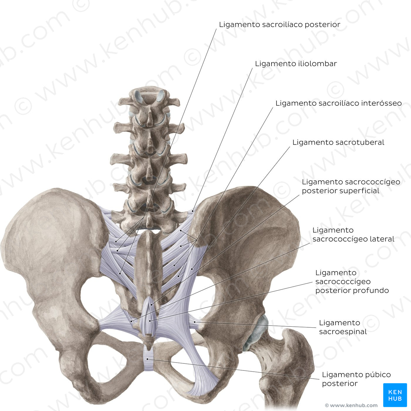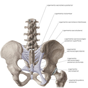 A articulação sacroilíaca é reforçada por três ligamentos, os ligamentos sacroilíacos anterior (veja a imagem anterior), interósseo e posterior. O ligamento sacroilíaco interósseo forma a principal ligação entre o ílio e o sacro, preenchendo os espaços entre esses dois ossos no aspecto posterossuperior da articulação. O ligamento sacroilíaco posterior encontra-se superficial ao ligamento sacroilíaco interósseo, e é formado por várias fibras que conectam a espinha ilíaca posterossuperior, a crista ilíaca e as cristas sacrais lateral e intermédia. Os dois ossos pélvicos da coluna vertebral (sacro e cóccix) são reforçados pelos ligamentos sacrococcígeos anterior (veja a imagem anterior) e posterior. O ligamento sacrococcígeo posterior superficial se origina da margem do hiato sacral e se insere no dorso do cóccix. O ligamento sacrococcígeo posterior profundo se estende da superfície dorsal do corpo da quinta vértebra sacral até a superfície dorsal do cóccix. O ligamento sacrococcígeo posterior lateral se estende bilateralmente dos ângulos inferolaterais do sacro até os processos transversos do cóccix. Dois importantes ligamentos localizados no aspecto posterior da pelve são os ligamentos sacroespinal e sacrotuberal. Eles transformam as incisuras isquiáticas menor e maior nos forames isquiáticos menor e maior. O primeiro se estende das margens do cóccix e do sacro até a espinha do ísquio, enquanto o último possui várias inserções na espinha ilíaca posterossuperior, nos ligamentos sacroilíacos posteriores, na crista sacral lateral e nas margens laterais dos aspectos inferior do sacro e superior do cóccix.Finalmente, o ligamento púbico posterior se mistura ao periósteo dos ossos púbicos posteriormente, e também pode ser identificado estan perspectiva.