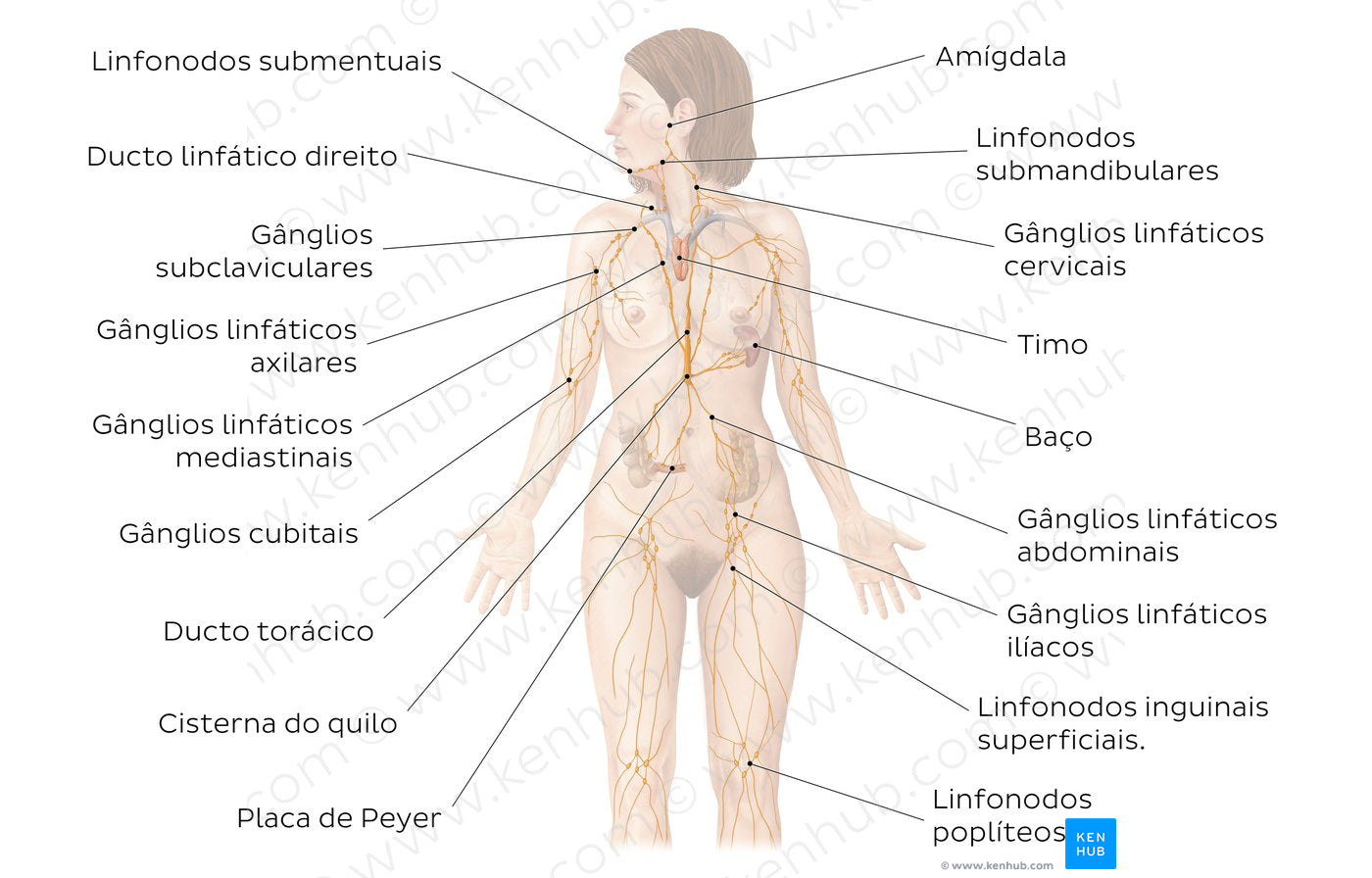 O sistema linfático é formado por uma rede de vasos linfáticos, tecidos linfoides e órgãos linfoides. Os dois principais vasos linfáticos coletores são o ducto linfático direito e o ducto torácico. O ducto linfático direito drena a linfa do braço direito e do lado direito da cabeça e do tórax, enquanto o ducto torácico drena o restante do corpo e abriga a cisterna do quilo. Linfonodos estão espalhados pelo corpo, os mais importantes para aprendermos são os cervicais, axilares e inguinais. Por último, nós temos os órgãos linfoides, ou seja, o baço, o timo, as placas de Peyer (nódulos agregados linfoides) e as tonsilas (palatinas, faríngea, linguais e tubárias). Junto com as tonsilas, as placas de Peyer e o apêndice são chamados de MALT, tecido linfoide associado à mucosa.