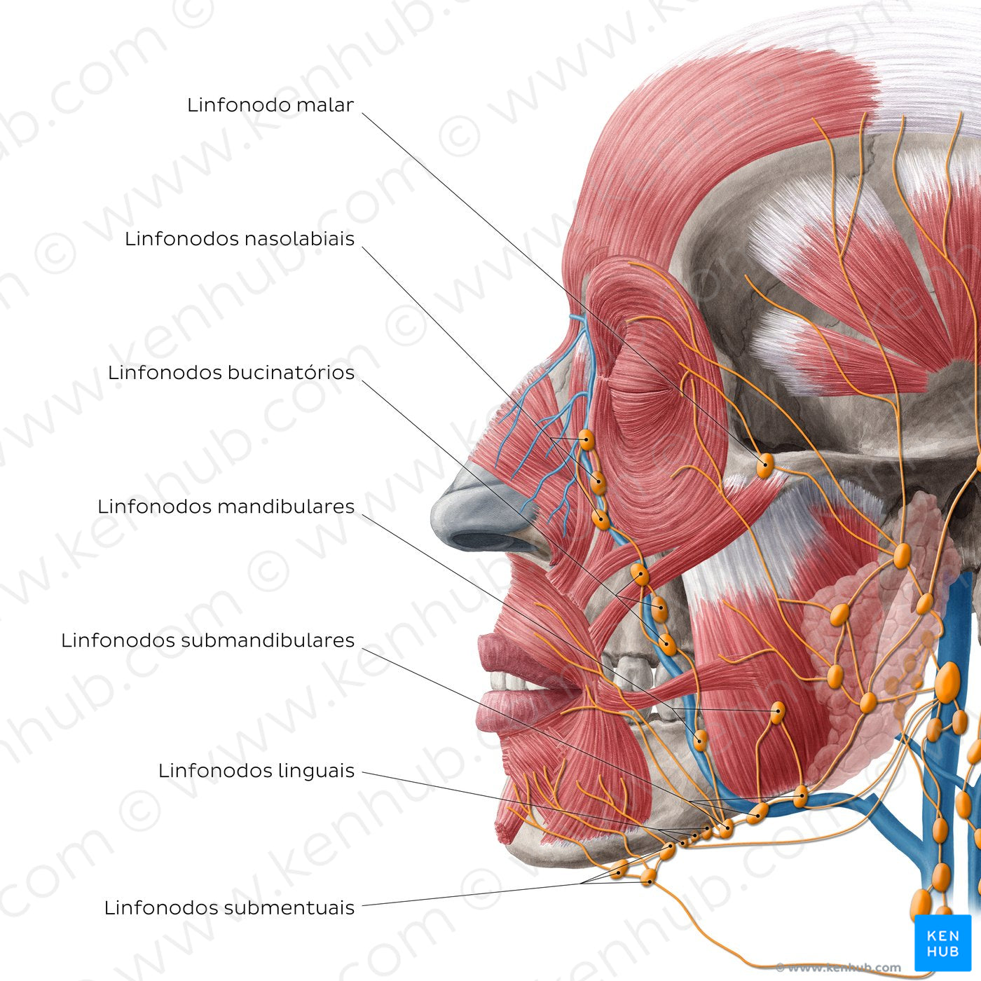 Os linfonodos da cabeça dividem-se, geralmente, em três grupos diferentes: os linfonodos linguais, os linfonodos faciais e um grupo de cinco linfonodos que formam o colar linfático pericervical (visível na próxima imagem). Os linfonodos linguais localizam-se nos espaços intermusculares do assoalho da cavidade oral e têm como função drenar a linfa da língua. Os seus vasos eferentes drenam para os linfonodos cervicais laterais profundos, submandibulares e/ou submentuais. Os linfonodos faciais localizam-se ao longo da veia facial e consistem nos linfonodos bucinatórios, nasolabiais, malar e mandibulares. Esse grupo de linfonodos drena as respectivas regiões da face para os linfonodos submandibulares.