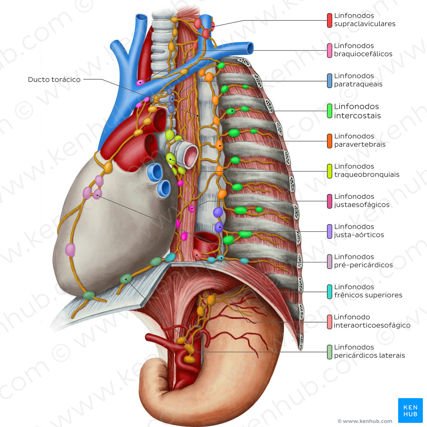 Vários grupos de linfonodos mediastinais (viscerais) são visíveis. Os linfonodos braquiocefálicos/mediastinais anteriores estão localizados na região anterior do mediastino superior, anteriormente aos grandes vasos. Os linfonodos traqueobrônquicos/mediastinais intermediários ficam próximos à bifurcação da traqueia, bem como nas porções superior e inferior dos brônquios principais.Os linfonodos justaesofágicos, interaorticoesofágicos e justa-aórticos são comumente agrupados como linfonodos mediastinais posteriores. Eles drenam os órgãos adjacentes, vasos e tecidos do mediastino posterior, e enviam vasos eferentes para os linfonodos paratraqueais e ductos torácico/linfático direito.Os linfonodos torácicos parietais visíveis nesta ilustração incluem os intercostais, justavertebrais e diafragmáticos superiores. Eles coletam a linfa dos músculos profundos do dorso e intercostais, pleura parietal e coluna vertebral. A linfa recolhida pelos linfonodos intercostais superiores (aproximadmente nos níveis 1-7) é drenada em um tronco intercostal comum destinado aos linfonodos supraclaviculares, enquanto os linfonodos intercostais inferiores geralmente drenam abaixo do diafragma, nos linfonodos gástricos ou celíacos/cisterna do quilo, antes de finalmente chegarem ao ducto torácico.Vasos eferentes dos linfonodos justavertebrais podem seguir um padrão de drenagem semelhante e/ou alternativamente passar através dos linfonodos mediastinais posteriores. Os linfonodos diafragmáticos superiores drenam o diafragma, a porção diafragmática do pericárdio e a pleura diafragmática. Eles normalmente drenam nos linfonodos paraesternais (não visíveis na imagem) ou mediastinais posteriores.