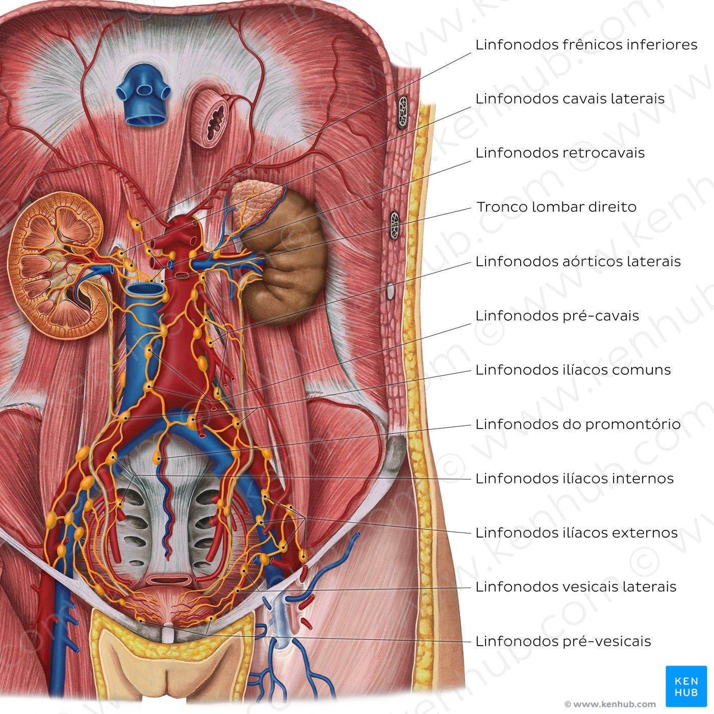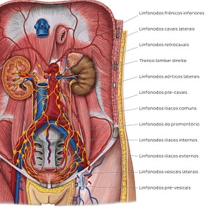 Na imagem vemos o compartimento retroperitoneal exposto, mostrando o sistema urinário (rins, ureteres e bexiga urinária), bem como os principais vasos abdominais e pélvicos. Os principais grupos de linfonodos da pelve e da parede abdominal posterior podem ser vistos. A linfa dos linfonodos paravesicais e ilíacos comuns, internos e externos em última análise converge para os linfonodos lombares. Estes por sua vez drenam para os troncos linfáticos lombares direito e esquerdo, que junto com o tronco linfático intestinal formam a cisterna do quilo.