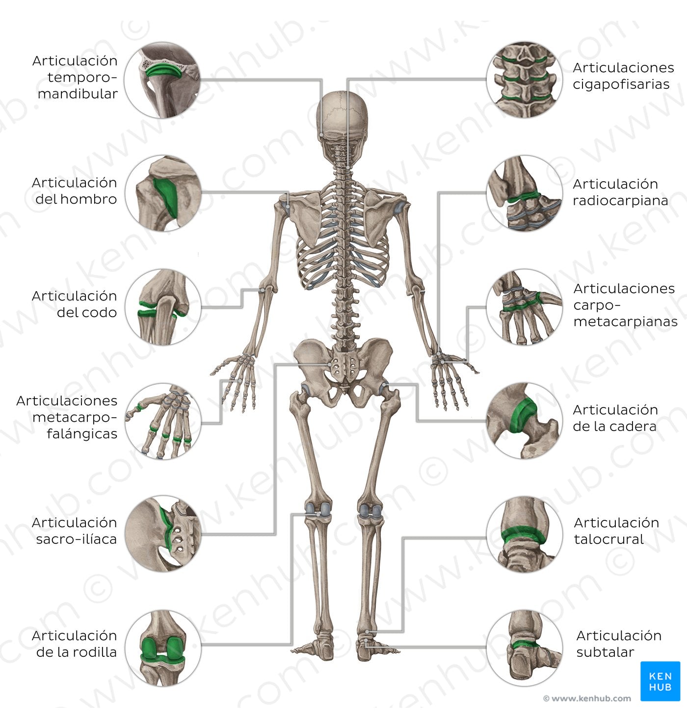 En la región de la cabeza, la articulación temporomandibular (ATM) permite el mayor rango de movimiento, estando compuesta por la mandíbula y el hueso temporal. La articulación que se encuentra más proximal en la parte inferior del cuerpo, es la articulación sacroilíaca, conectando el sacro con el ilion. Después, se encuentra la articulación de la cadera, compuesta por el fémur y el hueso coxal. Entre el muslo y la pierna se encuentra la articulación de la rodilla, compuesta por el fémur, la tibia y la rótula. Continuando más distal, se encuentra la articulación talocrural que conecta la tibia y la fíbula con el talus. En el pie, las articulaciones principales son la articulación subtalar, uniendo al talus con el calcáneo, y las articulaciones interfalángicas formadas por las falanges de los dedos de los pies.