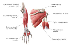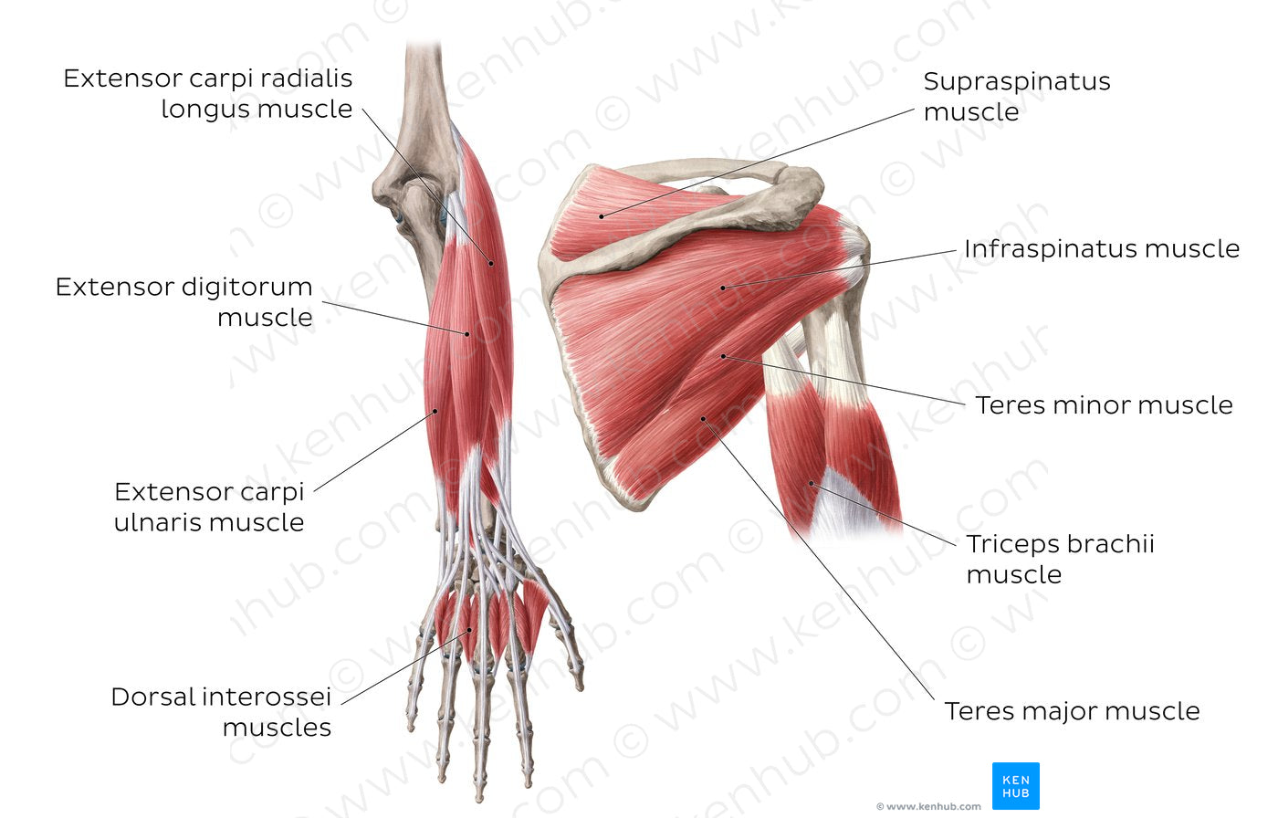 On the posterior aspect, the posterior compartment of the arm can be appreciated. The only muscle in this region is the triceps brachii muscle, the main extensor of the forearm. Moving distally, the muscles of the posterior compartment of the forearm can be seen, which act as the extensors of the hand. Some of the main extensor muscles include the extensor digitorum and brachioradialis. Lastly, the main muscles of the posterior aspect of the hand are the dorsal interossei muscles.