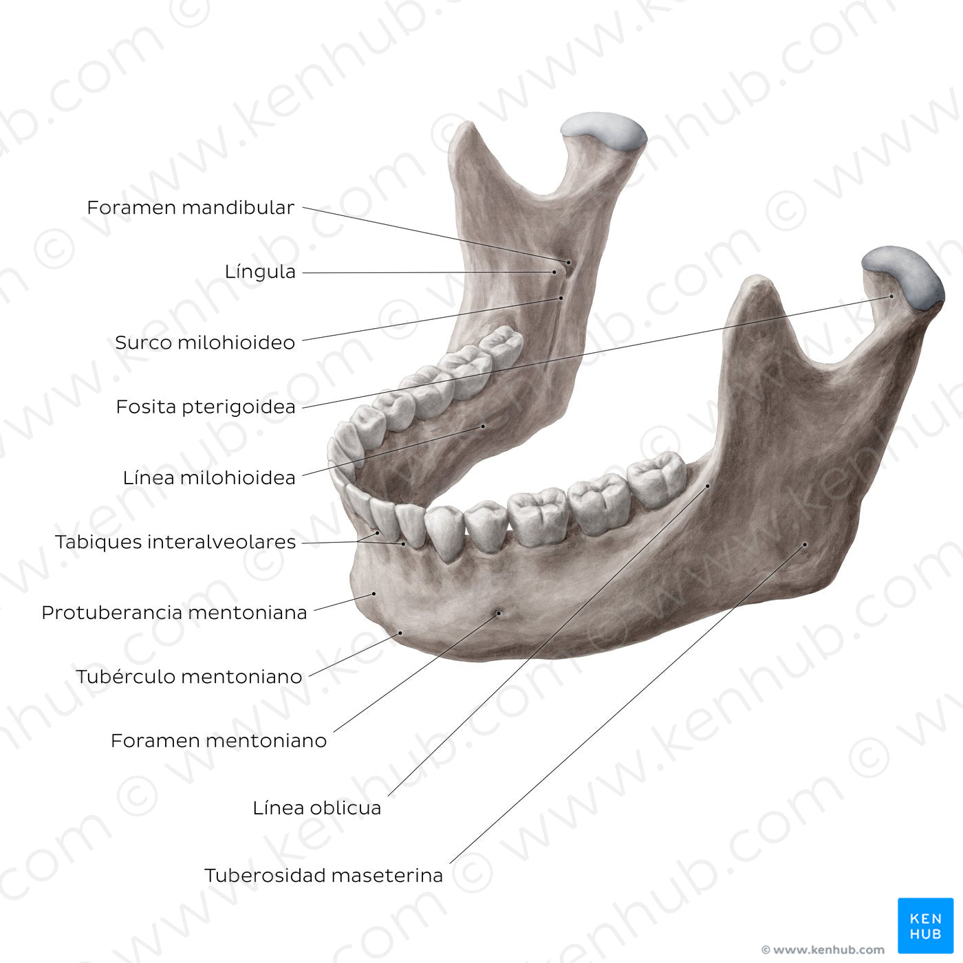 La protuberancia mentoniana está presente en la línea media de la base de la cara externa de la mandíbula y es contínua lateralmente a cada lado con los tubérculos mentonianos. Colectivamente estas estructuras forman la prominencia de la barbilla. Inferior a los dientes premolares mandibulares, a lo largo de la cara externa de la base de la mandíbula se encuentra una pequeña abertura conocida como foramen mentoniano, que permite el paso de la rama mentoniana de la arteria alveolar inferior, la vena mentoniana y el nervio mentoniano. Las líneas oblicuas del cuerpo de la mandíbula se continúan superiormente con el borde anterior de la rama de la mandíbula y se extienden anteroinferiormente hacia los tubérculos mentonianos. Estos forman el borde lateral de la fosa retromolar y proporcionan un lugar de origen para el músculo depresor del ángulo de la boca.La cara externa del ángulo de la mandíbula presenta una rugosidad para la inserción del músculo masetero conocida como tuberosidad maseterina.A lo largo del aspecto anterior de cada cuello de la mandíbula se encuentran dos depresiones pequeñas y superficiales conocidas como fositas pterigoideas, que proporcionan el lugar de inserción para el músculo pterigoideo lateral a cada lado. La cara interna de la rama de la mandíbula presenta el foramen mandibular (también conocido como agujero dentario inferior) que alberga a la arteria, vena y nervio alveolar. La abertura tiene una cresta prominente en su porción anterior conocida como língula de la mandíbula para la unión del ligamento esfenomandibular. El surco milohioideo discurre en dirección anteroinferior desde este punto y contiene al nervio milohioideo.