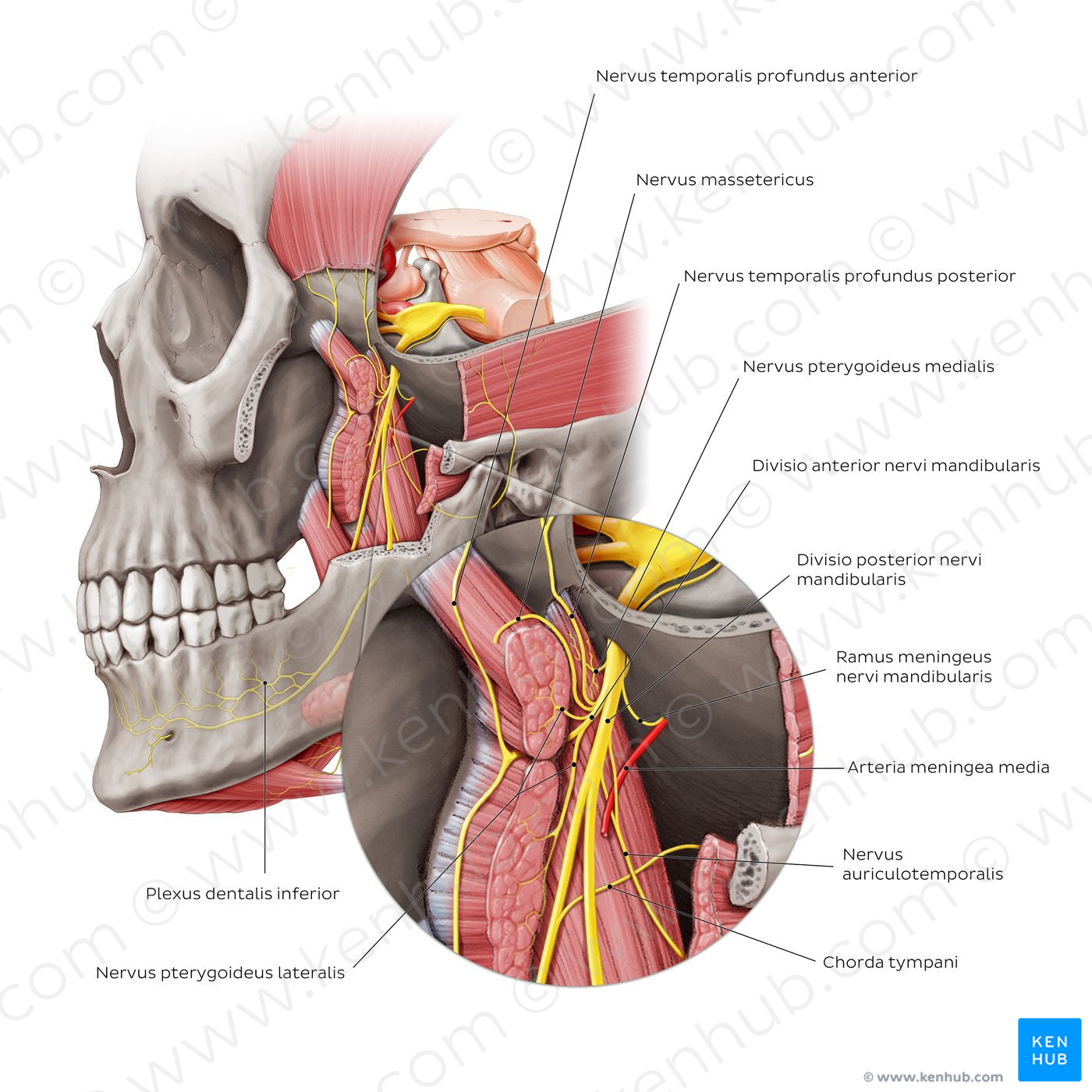 The n. mandibularis arises from the anterior portion of the gl. trigeminale. Accompanied by the radix motoria nervi trigemini, it exits the skull through the foramen ovale and enters the fossa infratemporalis. At this point, the radix motoria unites with the n. mandibularis, making it a mixed nerve. Within the fossa infratemporalis the mandibular trunk immediately gives off two branches: a r. meningeus which ascends through the foramen spinosum to supply dura of the fossa media cranii and a n. pterygoideus medialis which passes through the gl. oticum (not shown) to supply the m. pterygoideus medialis, m. tensor veli palatini, and m. tensor tympani. The n. mandibularis then splits into a divisio anterior et posterior. The divisio anterior passes efferent (motor) fibres to the n. massetericus, nn. temporales profundi and n. pterygoideus lateralis and receives afferent (sensory) fibres from the n. buccalis which supplies the skin over the cheek.