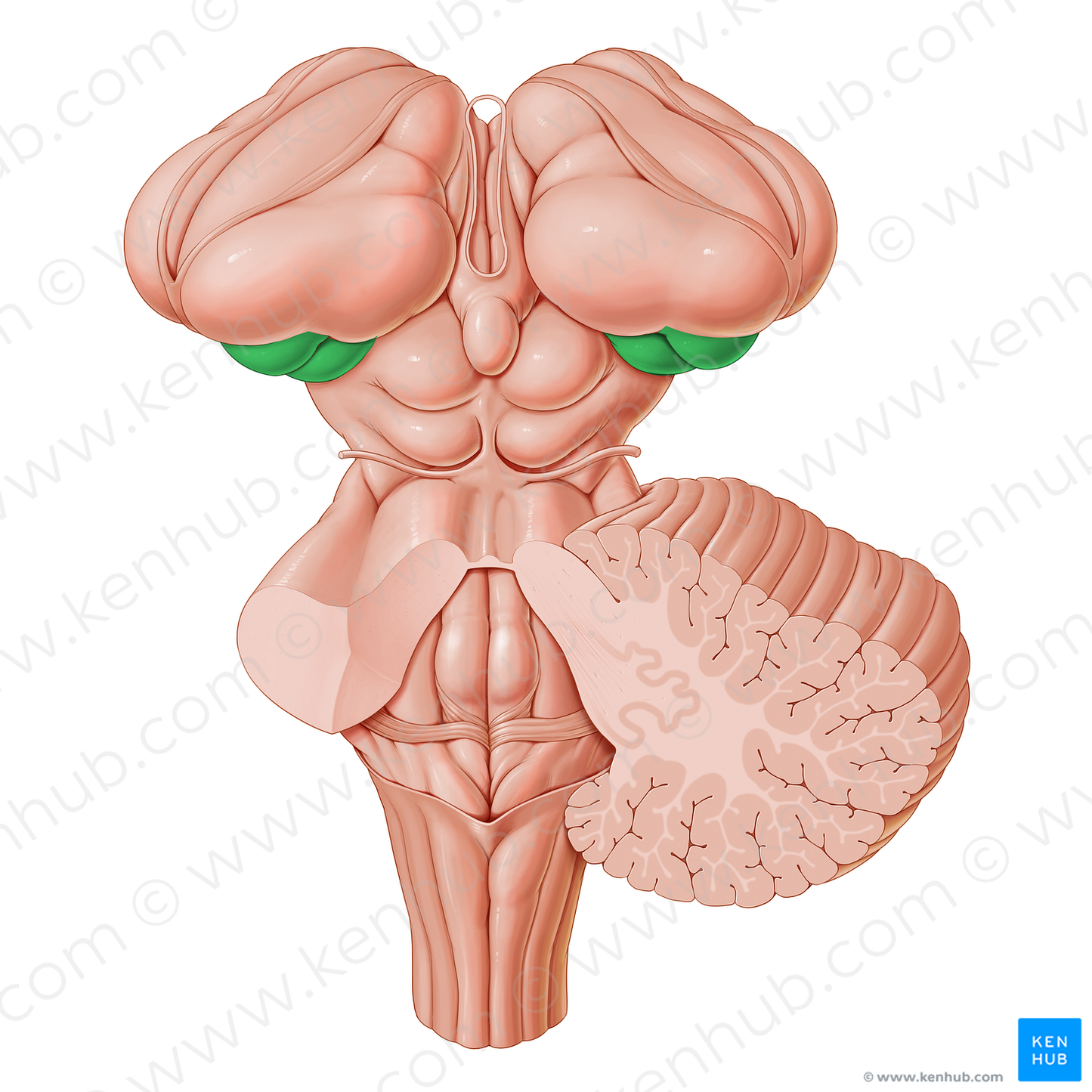 Shown from posterior perspective. Also known as Nuclei of geniculate bodies, Geniculate nuclei, and Medial and lateral geniculate bodies.