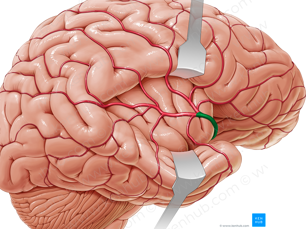 Shown from lateral right perspective. Also known as MCA, and Sylvian artery.