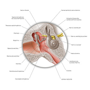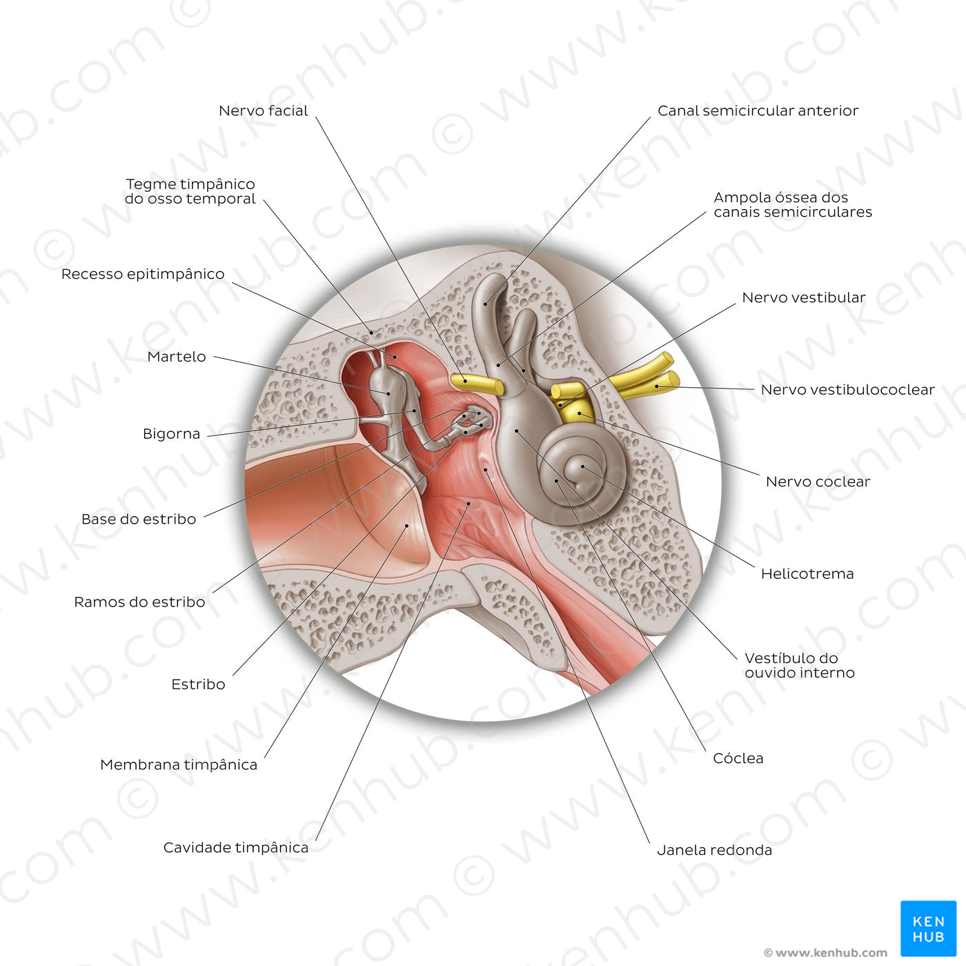 A orelha média é formada pela cavidade timpânica, um espaço estreito localizado na parte petrosa do osso temporal. Ela possui três ossículos auditivos (martelo, bigorna e estribo) que estão suspensos por ligamentos ossiculares e regulam a transmissão do som do ambiente externo para a orelha interna. A parede jugular/assoalho da cavidade timpânica possui a abertura faríngea da tuba auditiva, um conduto parte ósseo parte cartilaginoso que conecta a cavidade timpânica à nasofaringe.