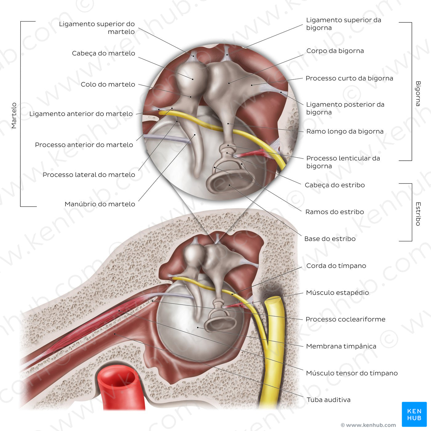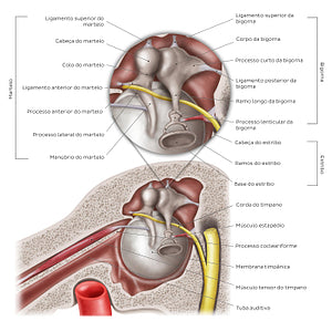 Esse corte sagital (vista medial) da orelha média permite uma melhor visualização dos três ossículos do ouvido, de suas partes e de seus ligamentos. O martelo é dividido em cabeça, colo, processos anterior e lateral e manúbrio. Ele é suspenso por três ligamentos: os ligamentos superior, anterior e lateral do maléolo. O ligamento superior não está visível nesta imagem. A bigorna tem um corpo e dois ramos, um curto e um longo, além de um processo lenticular. O estribo é formado por uma cabeça, um ramo anterior e um posterior e uma base. Ele é suspenso pelo ligamento anular do estribo, não visível nesta imagem. Já o músculo tensor do tímpano está claramente visível, ocupando o semicanal para o músculo tensor do tímpano do osso temporal e passando através do processo cocleariforme, que atua como uma polia para esse músculo. Esta vista também evidencia o músculo estapédio, que se insere no colo do estribo.