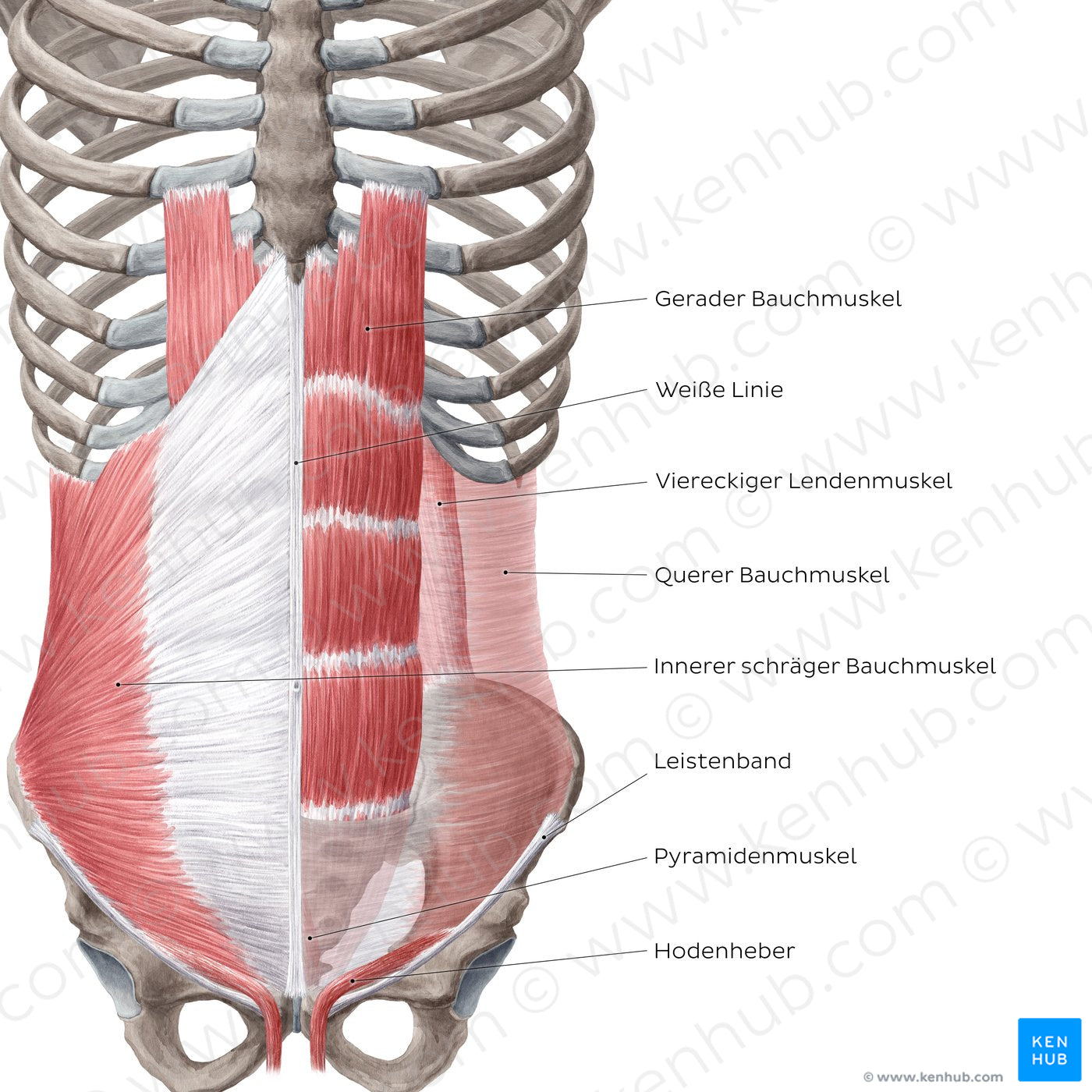 Der äußere schräge Bauchmuskel wurde entfernt, damit der innere schräge Bauchmuskel auf der linken Seite der Abbildung besser zu sehen wird. Der innere schräge Bauchmuskel rechts wird von superomedial verlaufenden Fasern gebildet, die sich entlang der weißen Linie zu einer Aponeurose formieren. Der gerade Bauchmuskel wird durch drei oder vier sehnige Stränge in Muskelsegmente unterteilt. Diese befinden sich je auf beiden Seiten der Linea alba. Die horizontalen Fasern des queren Bauchmuskels verlaufen in horizontaler Richtung und inserieren schließlich mittels einer Endsehne in das dorsale Blatt der Rektusscheide beziehungsweise kaudal der bogenförmigen Linie des Darmbeins.