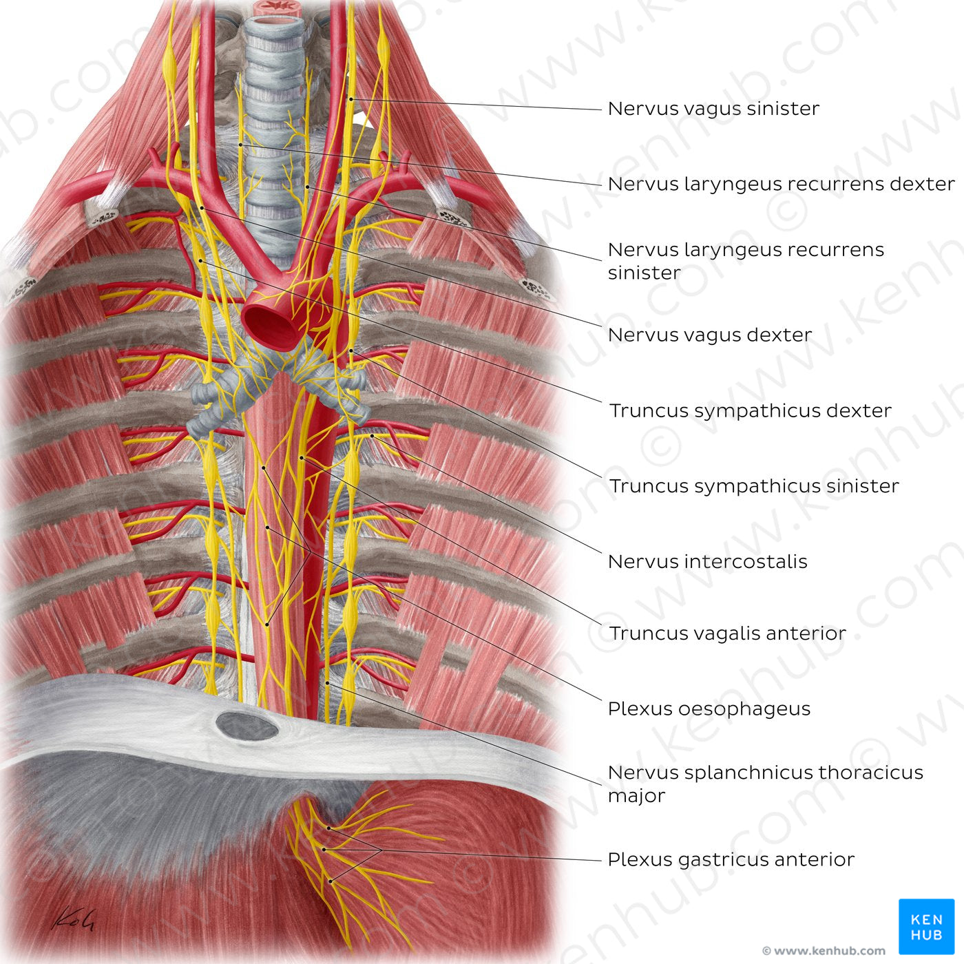 The plexus oesophageus, a network of parasympathetic and sympathetic fibers surrounds the esophagus and provides the nervous supply. The parasympathetic nervous supply mainly originates from the nervus vagus (CN X), while the sympathetic supply stems from the ganglia cervicalia et thoracica of truncus sympathicus, as well as nervi spinales T5-T12. Plexus myentericus and plexus submucosus (enteric nervous system; not pictured) are embedded in the esophageal wall and play an important role in controlling the peristalsis of the esophagus.