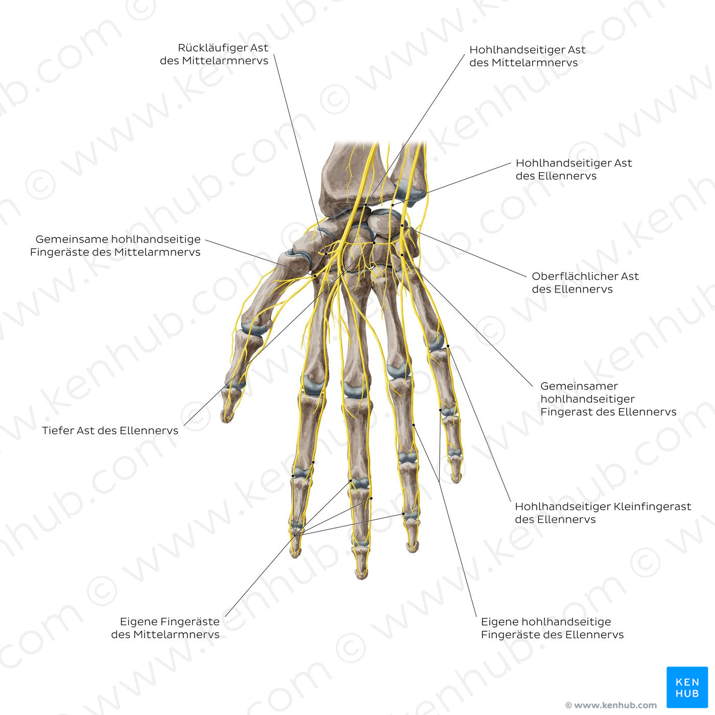 Die motorische Innervation der Hand erfolgt durch den Mittelarm- und den Ellennerv. Der Speichennerv trägt nur zur Innervation der Haut bei. Der Ellennerv gibt einen hohlhandseitigen Ast im distalen Unterarm ab, um sich dann vor dem Erreichen der Hand in einen oberflächlichen und tiefen Ast zu teilen. Der oberflächliche Ast des Ellennervs gibt einen gemeinsamen hohlhandseitigen Fingerast und einen hohlhandseitigen Kleinfingerast ab. Der gemeinsame hohlhandseitige Fingerast teilt sich weiter in zwei eigene hohlhandseitige Fingeräste des Ellennervs, die die angrenzenden Seiten des Ring- und kleinen Fingers versorgen. Der Ellennerv versorgt also das mediale Drittel der Handfläche und die palmare Fläche der medialen anderthalb Finger sensorisch. Sobald der Mittelarmnerv in seinem Verlauf die Hand erreicht, teilt er sich in hohlhandseitige, rückläufige und gemeinsame hohlhandseitige Fingeräste. Die gemeinsamen hohlhandseitigen Fingeräste teilen sich in eigene holhlhandseitige Fingeräste und versorgen den Bereich vom Daumen bis zum Mittelfinger sowie den radialen Anteil des Ringfingers. Der Mittelarmnerv versorgt also die lateralen zwei Drittel der Handfläche sowie das palmare und das dorsale distale Drittel der seitlichen dreieinhalb Finger sensibel.