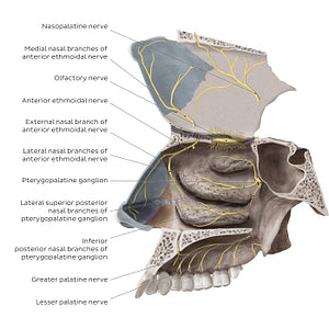 The nasal cavity is innervated by 3 nerves1. Cranial nerve I – Olfactory nerve2. Cranial nerve V – Trigeminal nerve3. Cranial nerve VII – Facial nerveThe olfactory nerve carries information of smell to the brain. The trigeminal nerve supplies the nasal cavity with sensation, where CN V1 (ophthalmic nerve) innervates the anterior nasal cavity and CN V2 (maxillary nerve) the posterior cavity. The facial nerve carries parasympathetic supply to nasal mucous glands.
