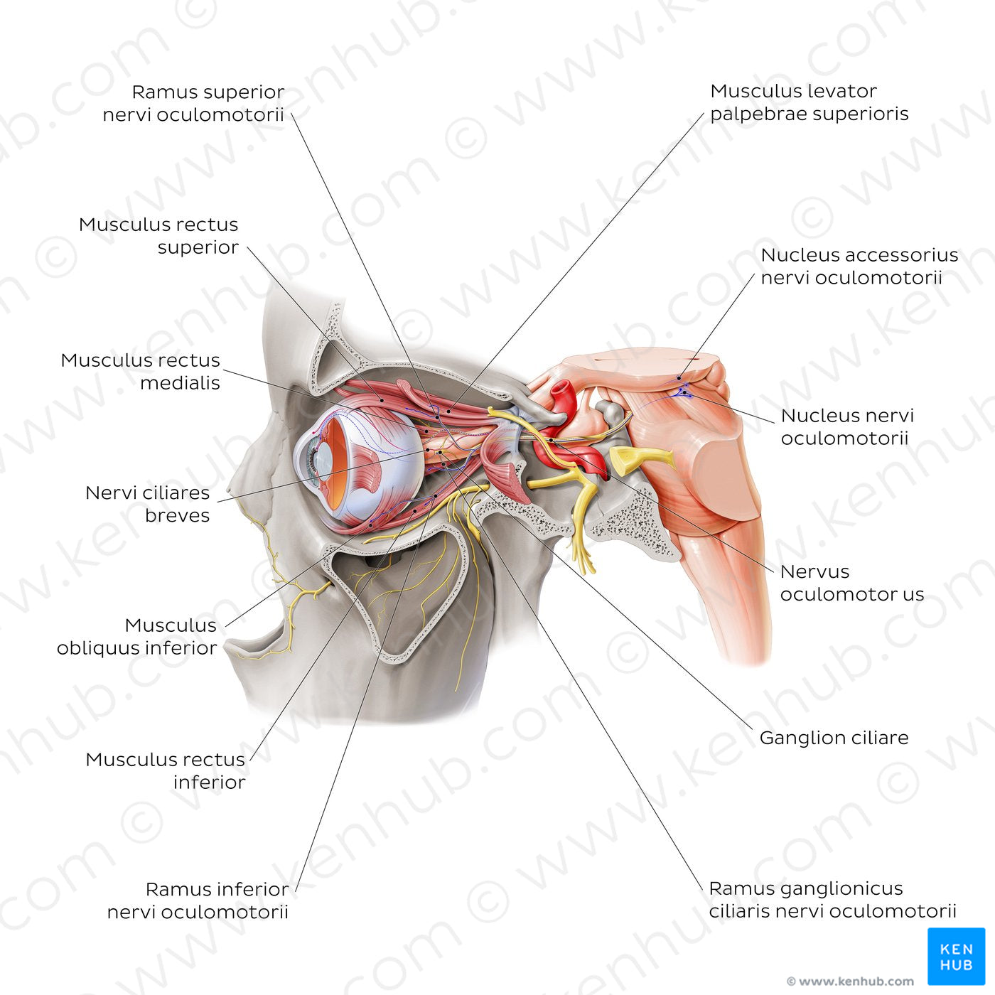 The n. oculomotorius (CN III) arises from the complexus oculomotorius which is located in the midbrain (mesencephalon), ventral to the substantia grisea periaquaeductalis, at the level of the colliculus superior. It is comprised of two nuclei: the ncl. nervi oculomotorii (contains cell bodies of general somatic efferent (GSE, motor) neurons), and the ncl. accessorius nervi oculomotorii (of Edinger-Westphal, contains cell bodies of general visceral efferent (GVE, parasympathetic) neurons). Efferent fibres emerge from the midbrain into the fossa/cisterna interpeduncularis as the n. oculomotorius, which continues through the lateral wall of the sinus cavernosus. From here, it enters the orbit the fissura orbitalis superior (internal to the anulus tendineus communis) as two branches which innervate the majority of the extraocular muscles:R. superior: m. rectus superior and mm. levator palpebrae superioris. R. inferior: m. rectus medialis, m. rectus inferior and m. obliquus inferior.The r. inferior also carries preganglionic parasympathetic fibers which synapse with postganglionic neurons in the ganglion ciliaris; these fibers provide parasympathetic innervation to the m. ciliaris and m. sphincter pupillae responsible for accommodation and pupillary constriction, via the nn. ciliares breves.