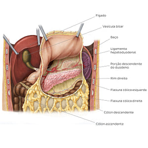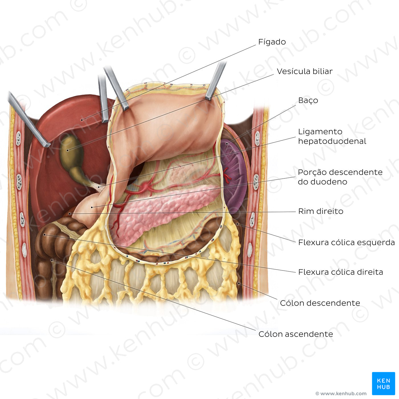 Cavidade abdominal com a parede posterior do estômago refletida. Posteriormente, o estômago se relaciona com a superfície anterior do pâncreas, o rim e a glândula suprarrenal esquerdos, a artéria esplênica e o baço, assim como com o mesocólon transverso, que separa o estômago da flexura duodenojejunal e do jejuno. Esses órgãos formam um leito raso que é separado do estômago pela bolsa omental. Também podemos ver a aorta abdominal dando origem ao tronco celíaco, que por sua vez dá origem, em última instância, às artérias gástricas direita e esquerda e à artéria gastromental.