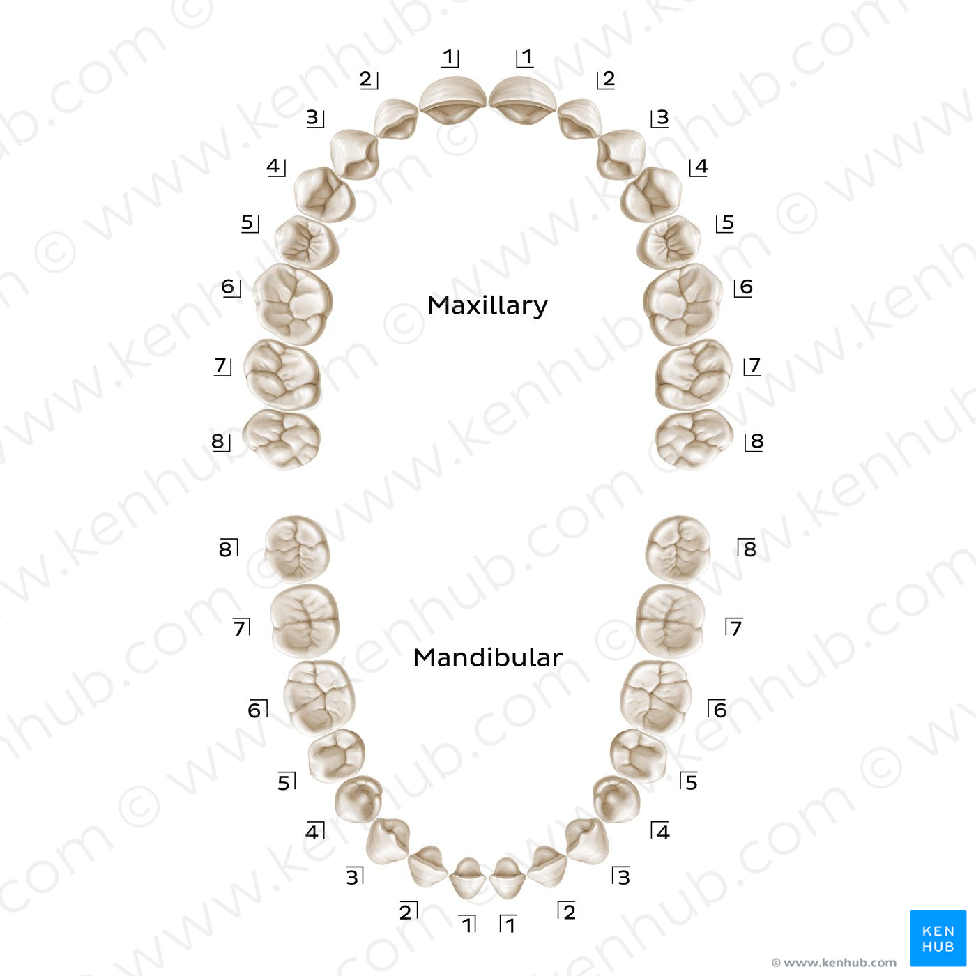 Palmer notation uses symbols ( ⏌,⎿ ,⎾ ,⏋) to designate which quadrant the tooth is located in rather than numbers. These symbols reference the relative position of the midline via vertical lines as well as differentiating between maxillary or mandibular arches via horizontal lines. Once again, the permanent dentition is numbered 1-8 (mesial to distal). As an example of this notation, the maxillary right second premolar ( 5⏌), receives the number 5, a horizontal line below it (representing a maxillary tooth) and a vertical line to the right of the number (representing that this tooth is located in a quadrant right of the midline (working mesial to distal). A variation of this notation, known as Haderup notation, replaces the Palmer symbols with ‘+’ for maxillary and ‘-’ for mandibular, placed before or after the tooth number to denote the quadrant (e.g. +1, 1+, -1, 1- etc.)