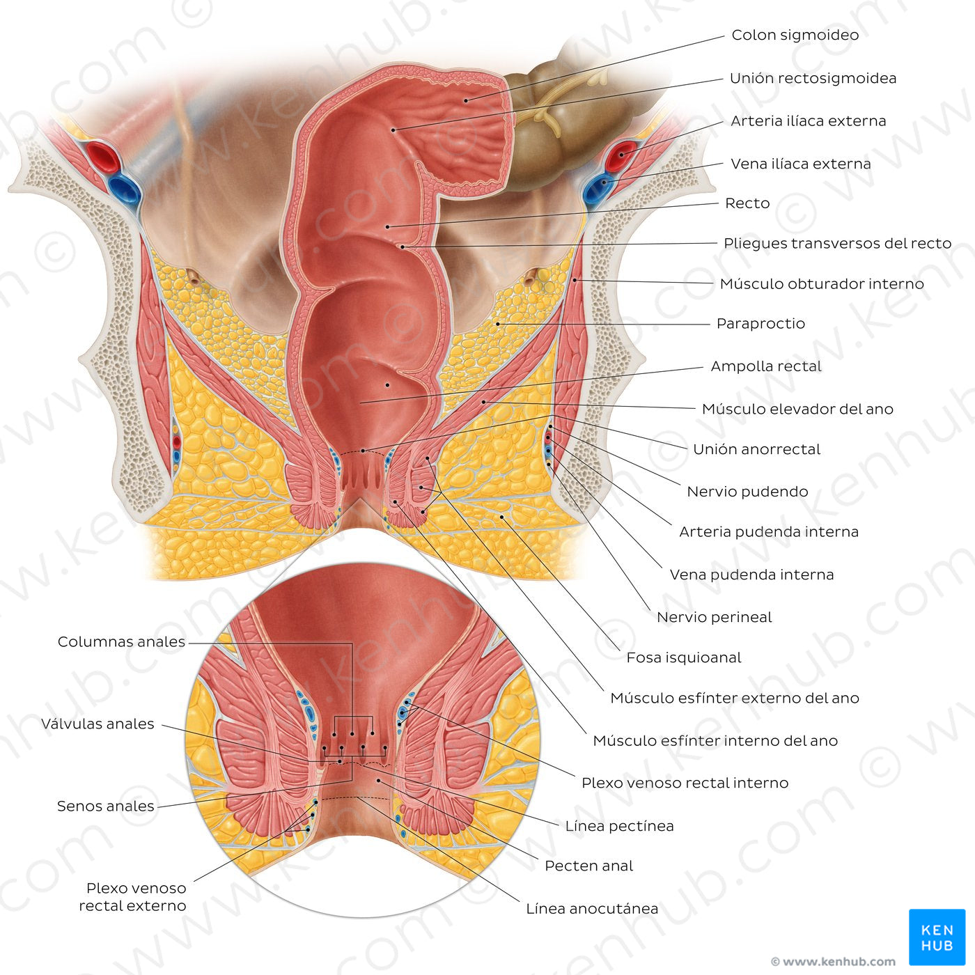 El recto se extiende desde la unión rectosigmoidea, superiormente, hasta la unión anorrectal, inferiormente. Cuatro pliegues transversos crean las tres flexuras laterales del recto (superior, intermedia e inferior). El canal anal alberga a las columnas anales, que están conectadas entre sí en el extremo distal por pliegues conocidos como válvulas anales. Entre las columnas anales encontramos los senos anales, donde se abren los conductos excretores de las glándulas del canal anal. Las válvulas anales forman una línea irregular denominada línea pectínea, que es un reparo anatómico importante. El canal anal se extiende hacia abajo hacia la línea anocutánea, que representa la transición entre el ano y la piel perianal. La región entre la línea pectínea y la línea anocutánea es conocido como pecten anal. El músculo esfínter interno del ano rodea los dos tercios superiores del canal anal, mientras que el músculo esfinter externo se observa externol a los dos tercios inferiores del canal anal. El músculo elevador del ano puede ser observado extendiéndose inferiormente, donde su porción puboanal (músculo puboanal o músculo puborrectal) se suspende alrededor de la unión anorrectal. La región constituida por tejido adiposo que se interpone entre el canal anal y el isquion es denominada fosa isquioanal.