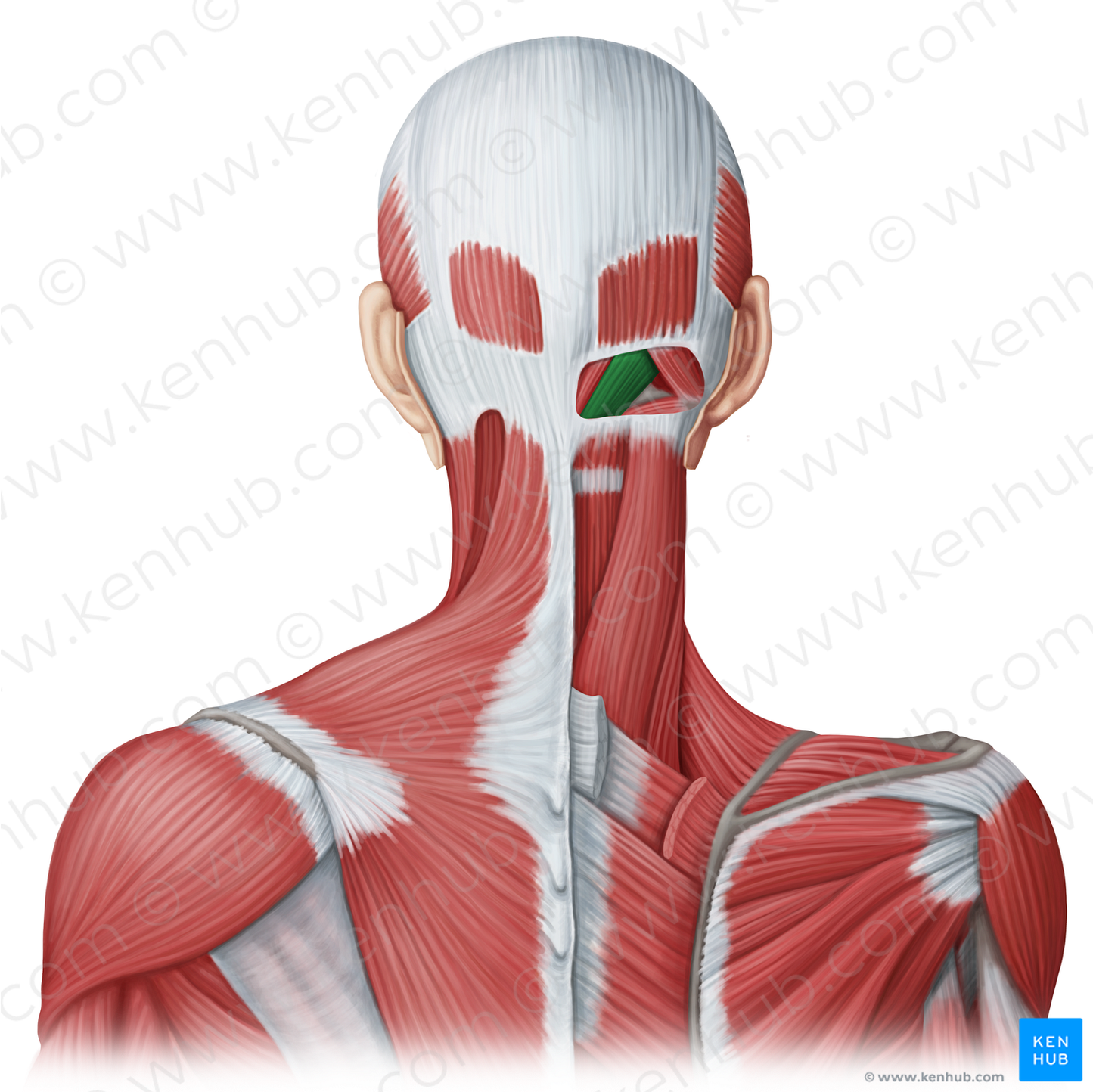 Shown from posterior perspective. Also known as Rectus posterior major capitis muscle, and Rectus capitis dorsalis major muscle.