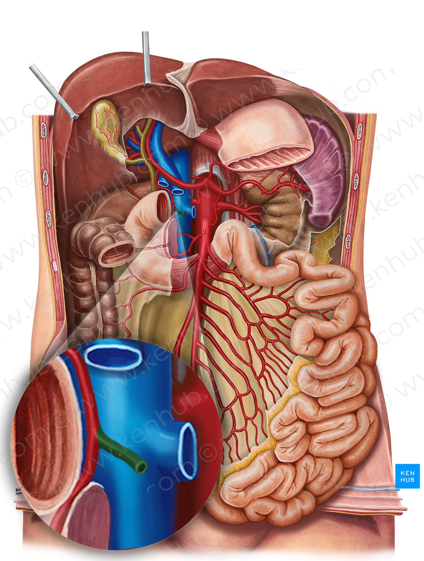 Shown from anterior perspective. Also known as Right gastroepiploic artery.