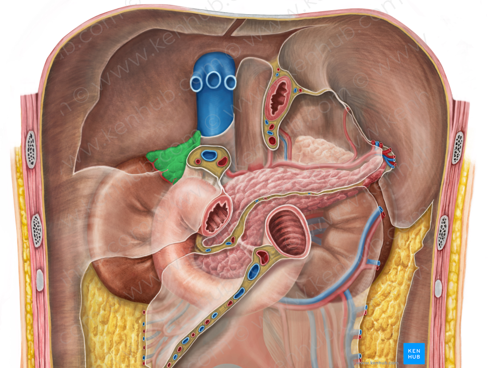 Shown from anterior perspective. Also known as Right adrenal gland.