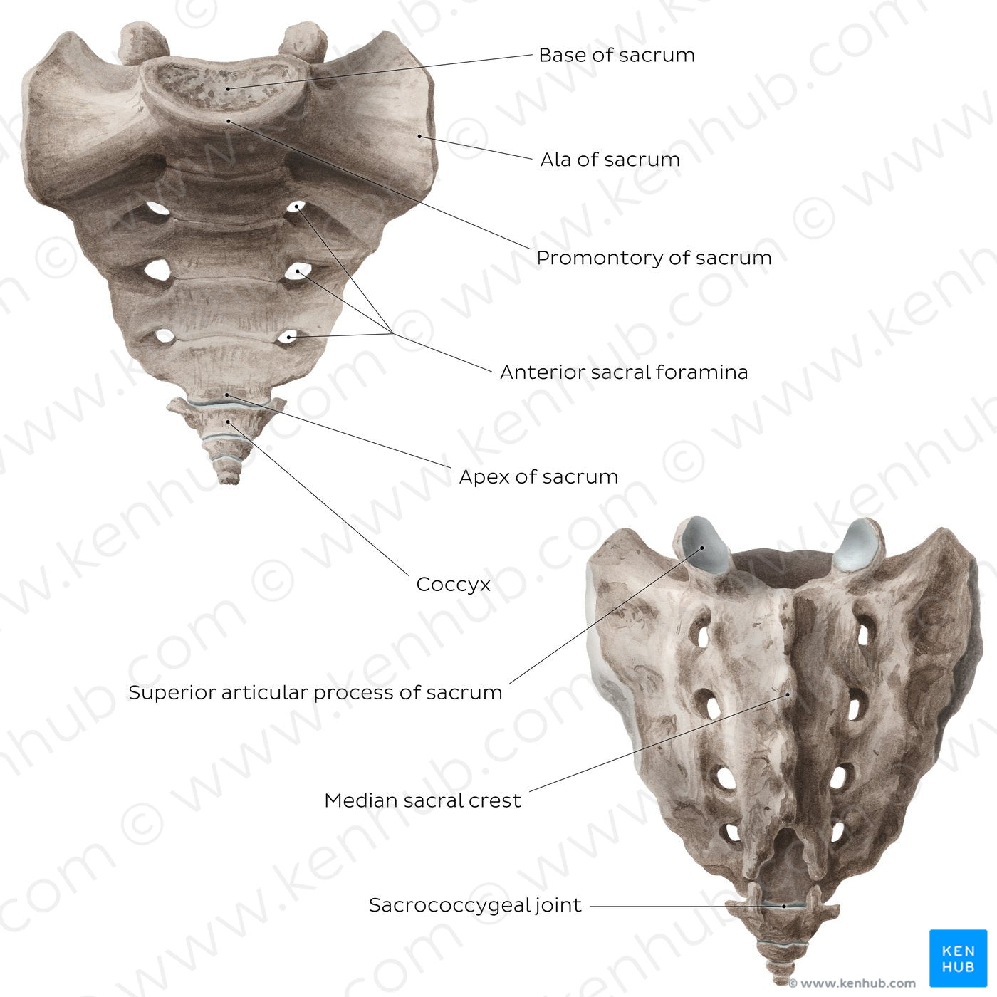 The lumbosacral joint is formed between the vertebrae L5 and S1. It consists of two separate articulations: the anterior intervertebral joint formed by the L5/S1 intervertebral disc and the two posterior zygapophysial (facet) joints between their articular processes. The lumbosacral symphysis is strengthened and stabilised by the iliolumbar and lumbosacral ligaments. The transverse ridges located on the anterior or pelvic surface of the sacrum indicate the site of fusion of each sacral vertebra. The sacroiliac joint is formed by the synovial articulation between the sacrum and ilium anteriorly and by the syndesmoses between their tuberosities posteriorly. The sacroiliac joint is stabilised by the anterior, interosseous and posterior sacro-iliac ligaments. An intervertebral disc lies between the apex of the sacrum and base of the coccyx to form the secondary cartilaginous sacrococcygeal joint. Reinforcing this joint are the superficial posterior, deep posterior, anterior and lateral sacrococcygeal ligaments, as well as the sacrotuberous and sacrospinous ligaments. Stabilising the intercoccygeal joints, which are frequently fused inferiorly, are the sacral portions of the supraspinous and anterior longitudinal ligaments as well as the anterior and lateral sacrococcygeal ligaments.