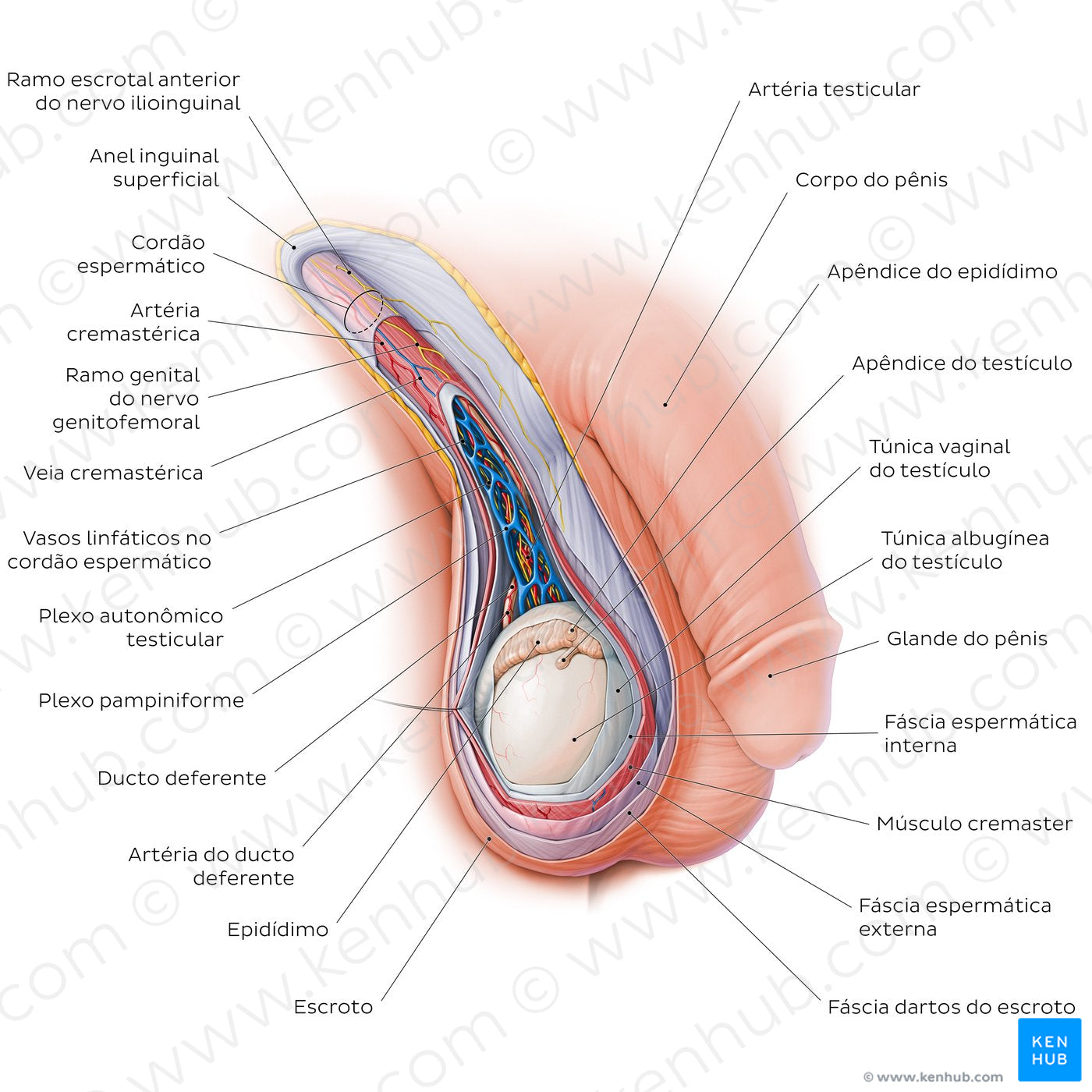 Anatomia do escroto e do cordão espermático. O escroto é formado por várias camadas: pele, fáscia dartos (com o músculo dartos), fáscia espermática externa, fáscia cremastérica (com o músculo cremaster) e fáscia espermática interna. A fáscia espermática interna adere frouxamente à camada parietal da túnica vaginal do testículo. As estruturas do cordão espermático incluem o ducto deferente, a artéria do ducto deferente, a artéria testicular, o plexo pampiniforme, a artéria e veia cremastéricas, o ramo genital do nervo genitofemoral, o plexo autonômico testicular e os vasos linfáticos do cordão espermático. As fáscias que revestem o cordão espermático são: a fáscia espermática interna, a fáscia cremastérica (com o músculo cremaster) e a fáscia espermática externa.