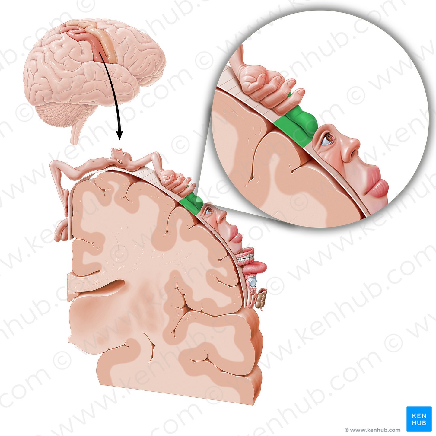 Shown from coronal perspective. Also known as Somatosensory cortex of thumb.