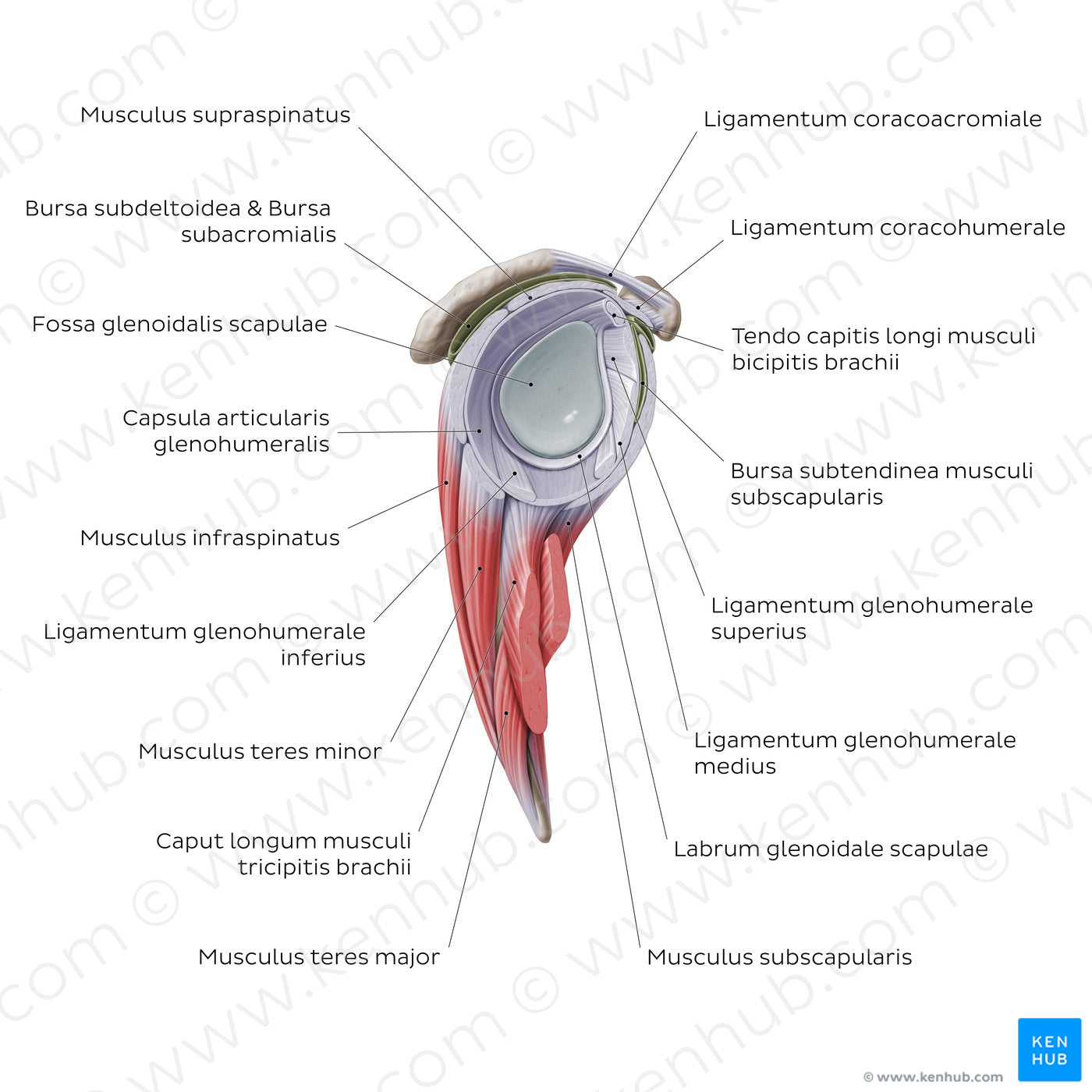 We can see that there are several ligaments that reinforce the capsula articularis and stabilize the joint. These are the ligg. coracohumerale and transversum humeri, that support the joint from its superior side, and the ligg. glenohumerale superius, medius and inferius that support it from the anteroinferior side. In this view, we can also see the musculi cuffiae musculotendineae converging to surround the shoulder joint; these are the mm. supraspinatus, infraspinatus, teres minor and subscapularis.
